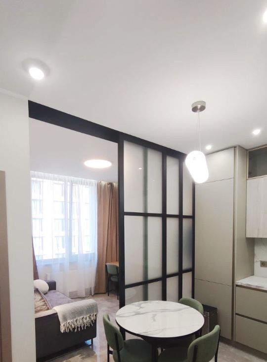 Уникальное планировочное решение: отдельная мастер-спальня + кухня-гостиная разделяется раздвижной перегородкой, отделяя второе жилое пространство с удобным раскладывающийся диваном.