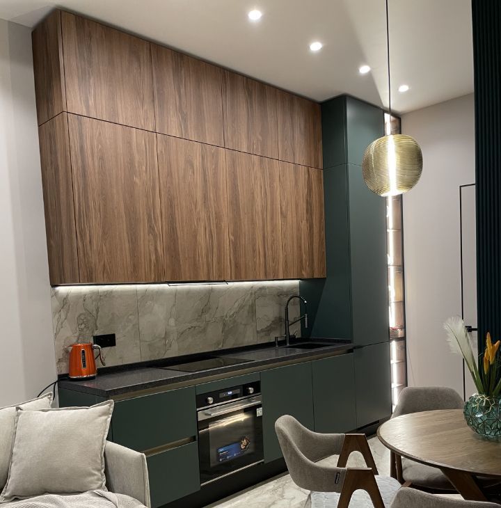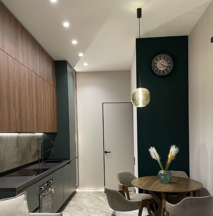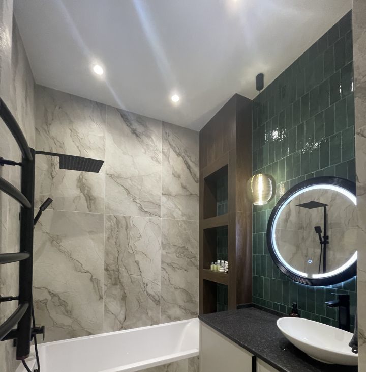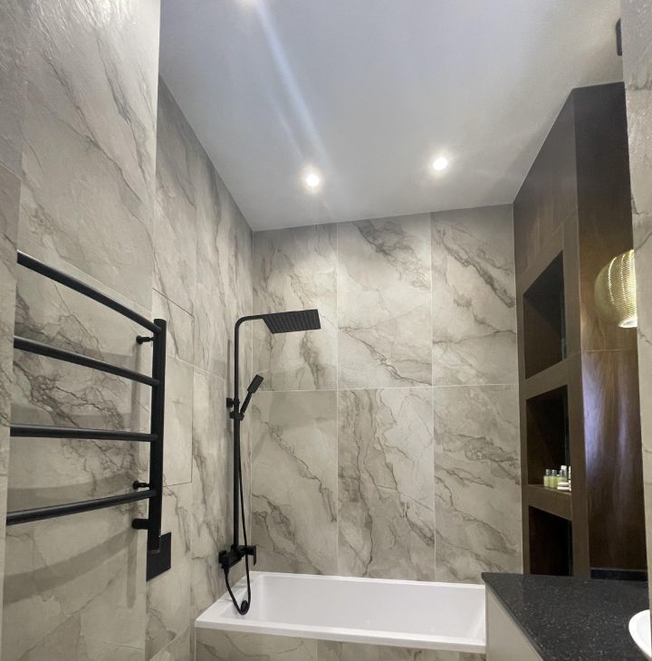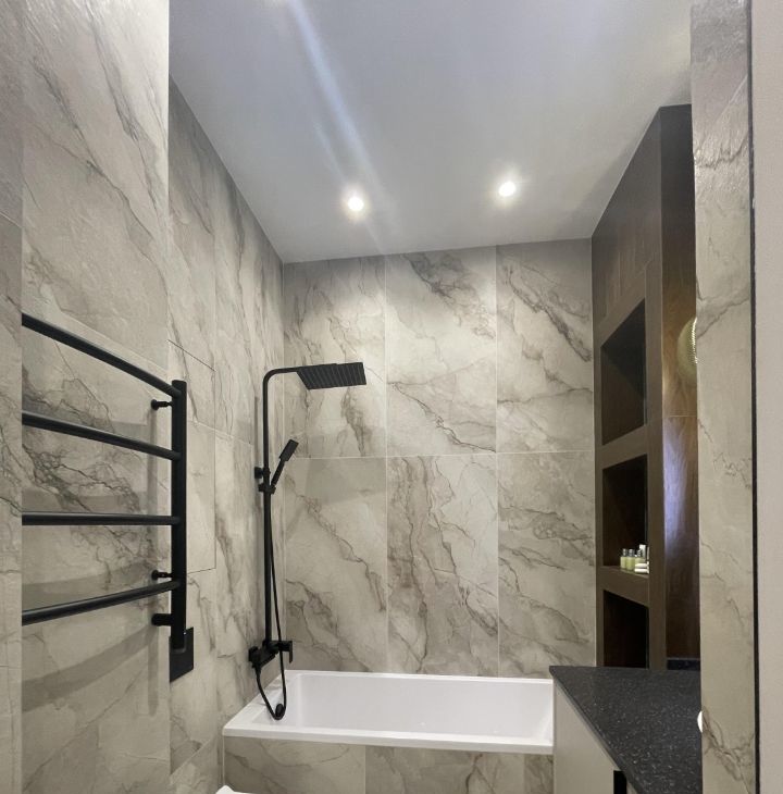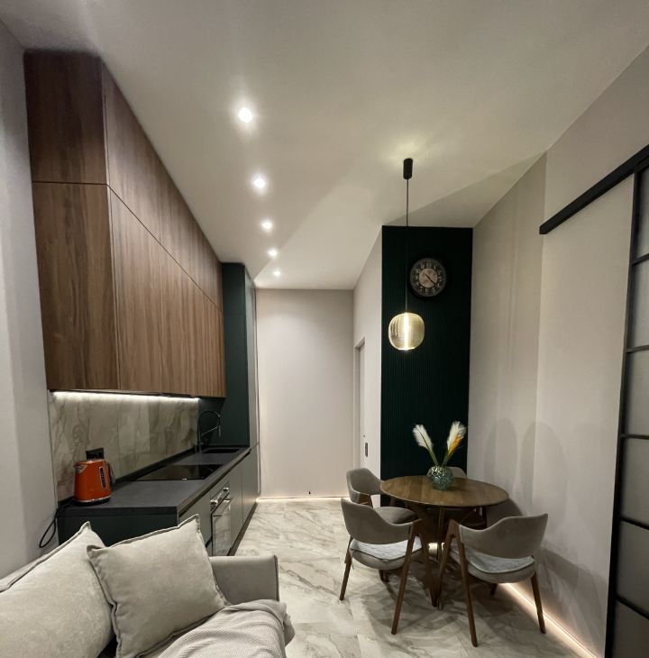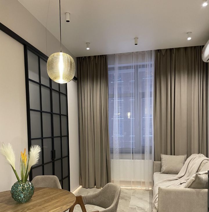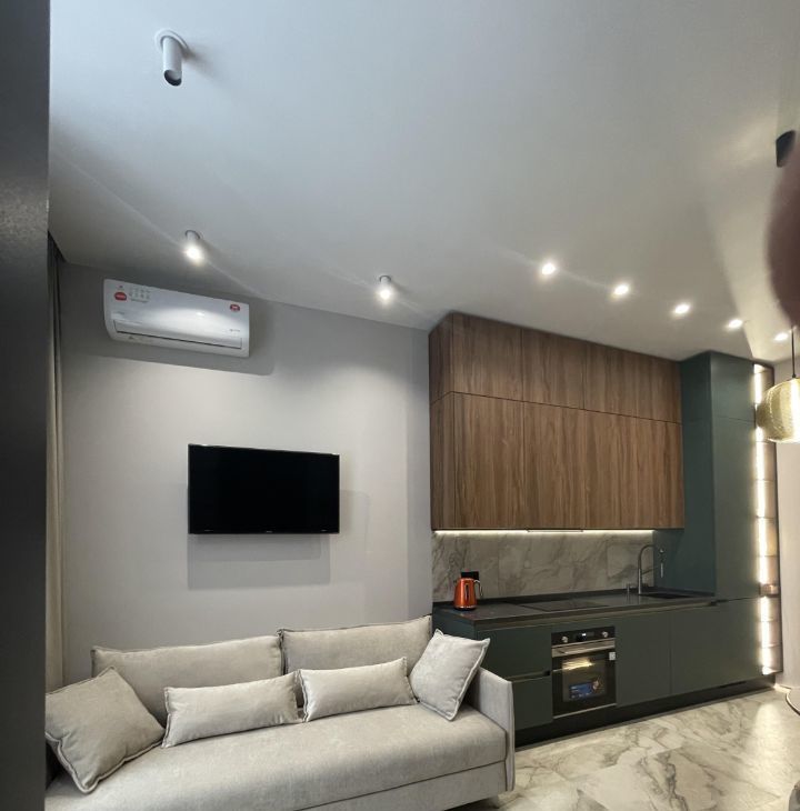 В квартире сделан дизайнерский ремонт, что придаёт ей уникальный и современный вид. Для вашего комфорта предусмотрена вся необходимая техника: кондиционер, холодильник, посудомоечная машина, телевизор и стиральная машина. Кухня площадью 16.8 кв. м полностью меблирована и оборудована для удобной готовки. В комнате также есть мебель, создающая уютную атмосферу для отдыха. В санузле установлена ванна, где можно расслабиться после долгого дня.