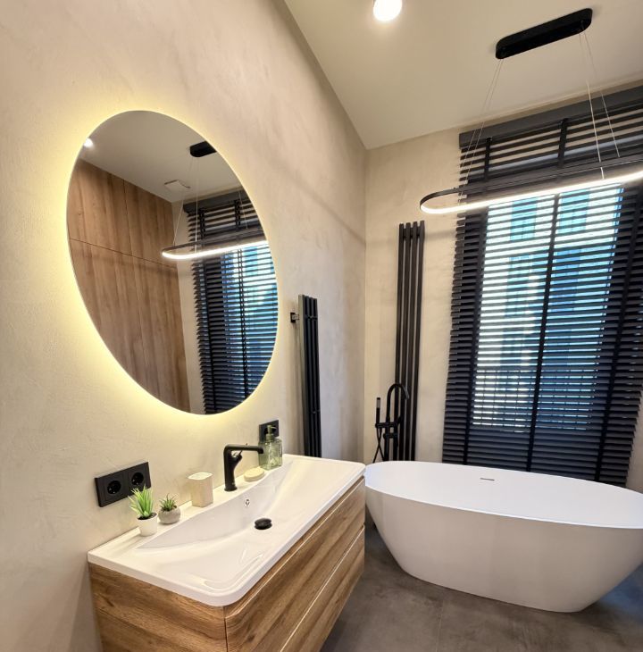 Большая ванная комната с дизайнерской ванной и душевой кабиной, отдельно расположен гостевой санузел.