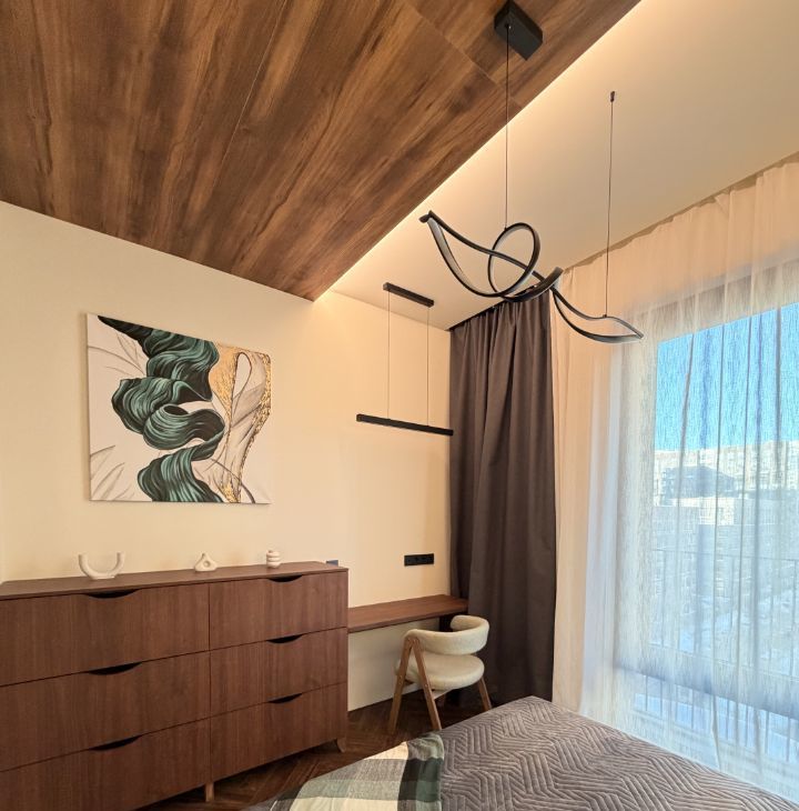 Уютная спальня с большой кроватью и рабочей зоной. Отдельная гардеробная комната с постирочной.
