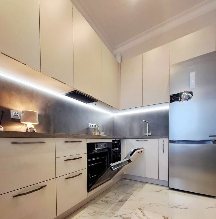 В кухне гарнитур ( производство Стильные Кухни) со всей необходимой бытовой техникой. А также - красивым набором посуды, столовыми приборами, стеклянной барной посудой, комплектом шумовок/лопаток, комплектом кастрюль из нерж. стали.