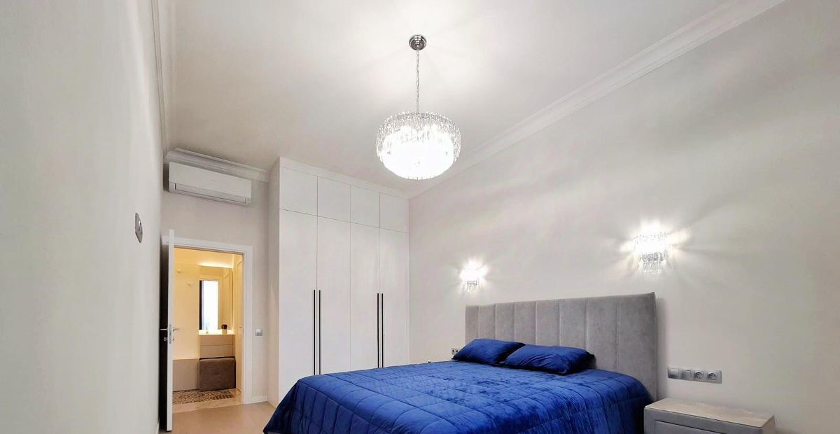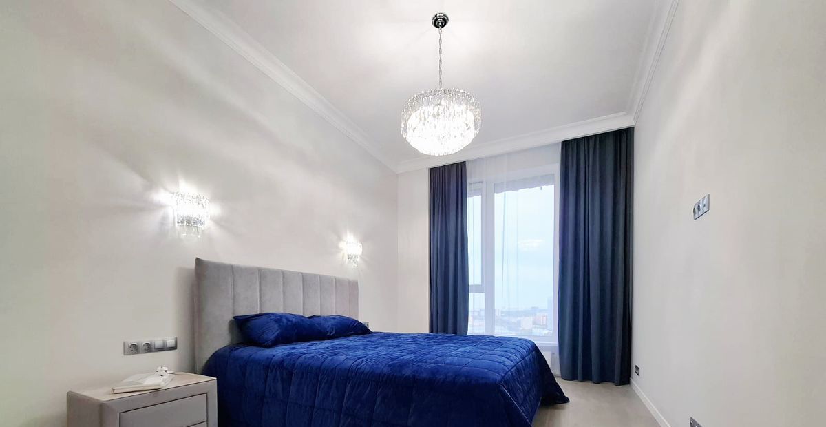 В спальне - кровать с мягким изголовьем, с высоким и комфортным, ортопедическим матрасом, 2 прикроватные тумбы (производство MOON) и уютные прикроватные коврики. Люстра и бра наполняет комнату волшебным "хрустальным" светом.