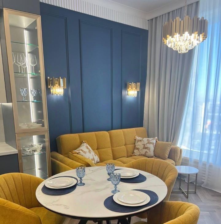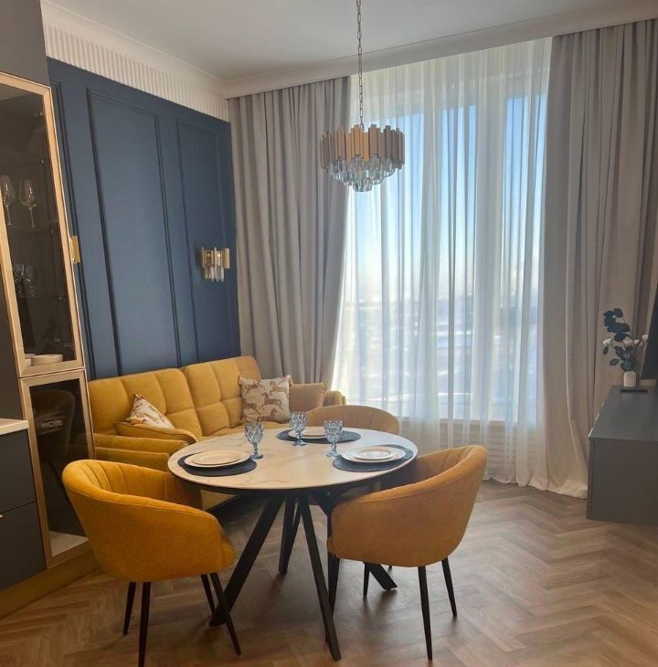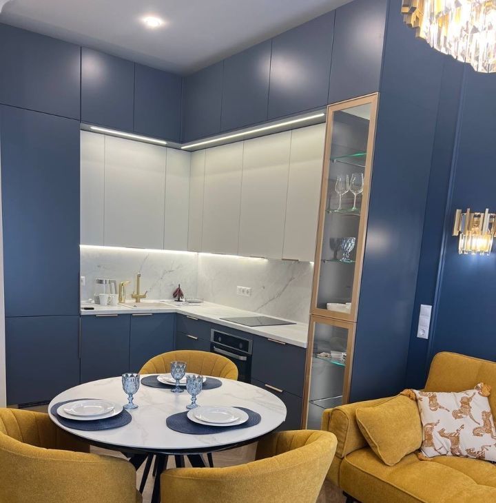 • Просторная гостиная-кухня, где утро начинается с запаха свежего кофе, а вечер заканчивается разговорами при мягком свете. Место, где вы готовите что-то вкусное на идеальной кухне, а в это время по квартире разливается джаз и мягкий свет скрывает за окном городскую суету.