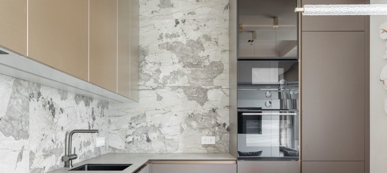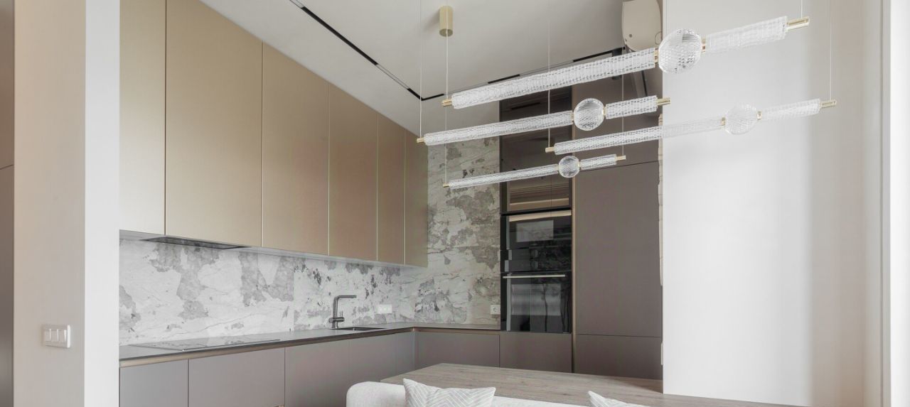 В просторной кухне-гостиной кухонный гарнитур со встроенной индукционной варочной поверхностью, вытяжкой, духовкой, микроволновкой, холодильником и посудомоечной машиной. Также установлены фильтры питьевой воды. Обеденная зона удобно расположена за диваном прямо перед телевизором, что бы наслаждаться просмотром фильмов и любимых программ. У подоконника уютное место как продолжение дивана для отдыха и любования закатами.