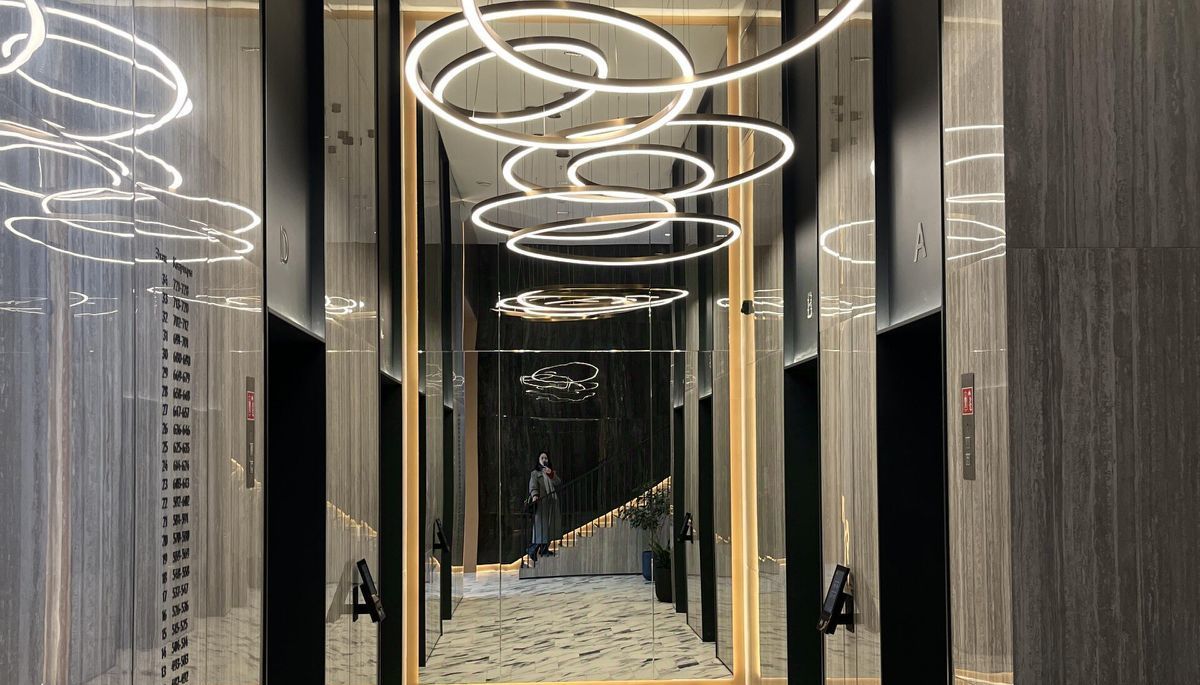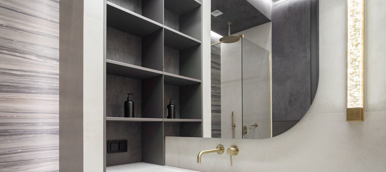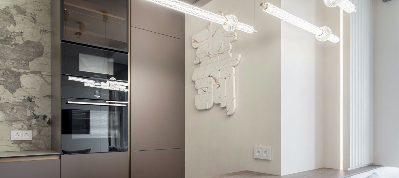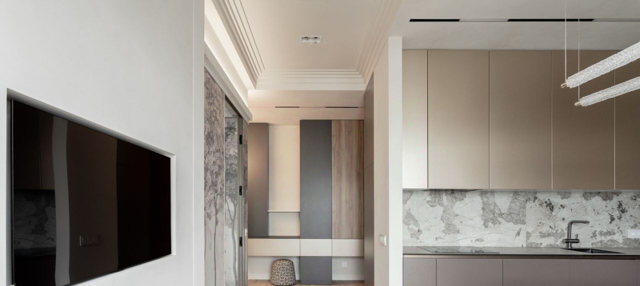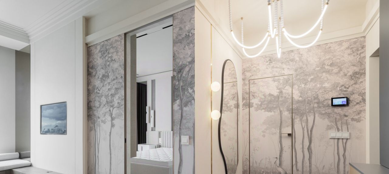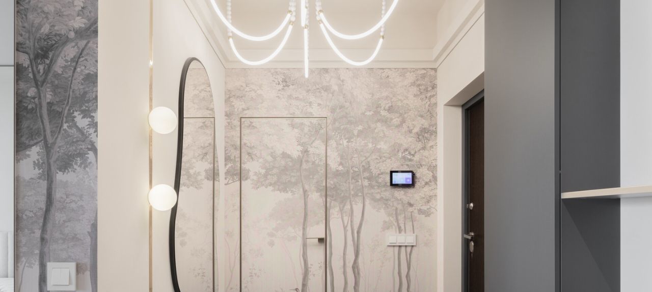 Уже при входе в квартиру вы попадаете в эффектную и стильную прихожую с необычной люстрой и дизайнерским зеркалом в полный рост. В холле имеется большой встроенный шкаф во всю стену. Бонусом в квартире оборудована гардеробная комната!