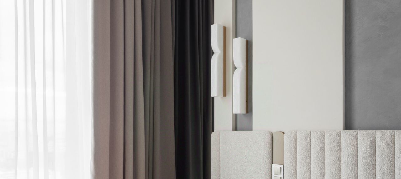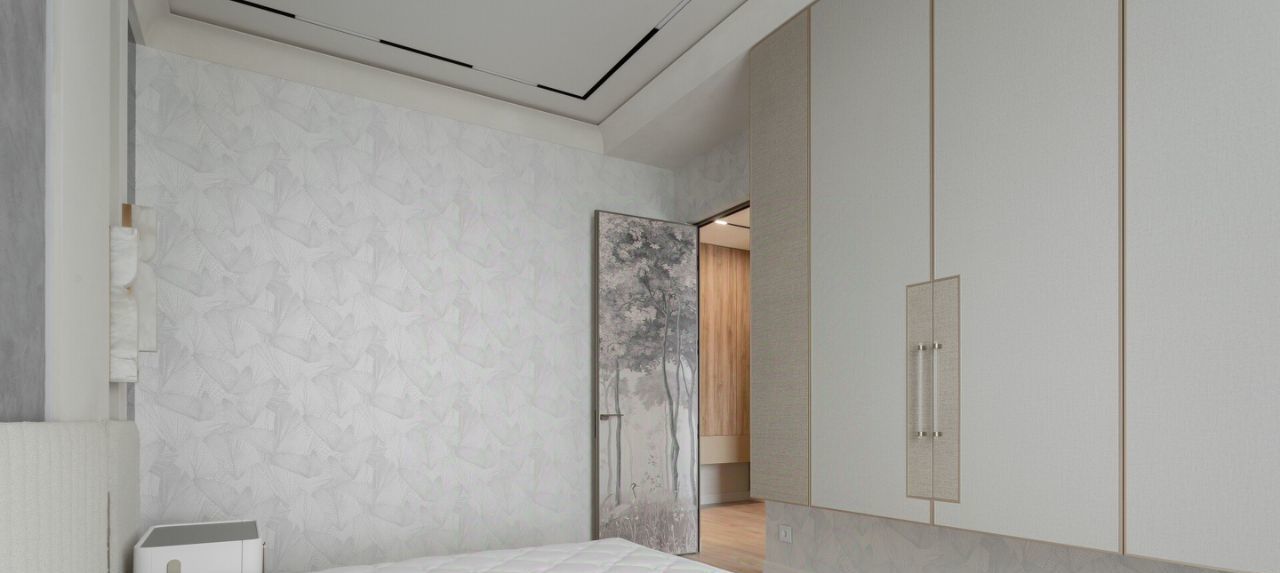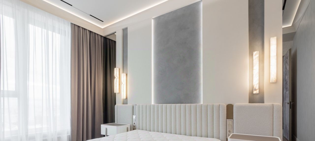 В спальне большая двуспальная кровать с ортопедическим матрасом, прикроватные тумбы, зеркала и стильные светильники, а также большой вместительный шкаф для одежды.
