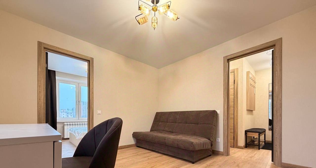В квартире площадью 38,2 кв. м изолированная спальная и проходная гостиная, отдельная кухня, совмещенный санузел.
