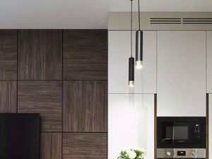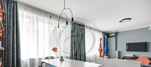 В просторной гостиной чётко выделены зона кухни-столовой, со всей необходимой бытовой техникой и телевизионная зона с удобной мягкой мебелью. Элементы декора на заказ придают квартире неповторимый лоск.