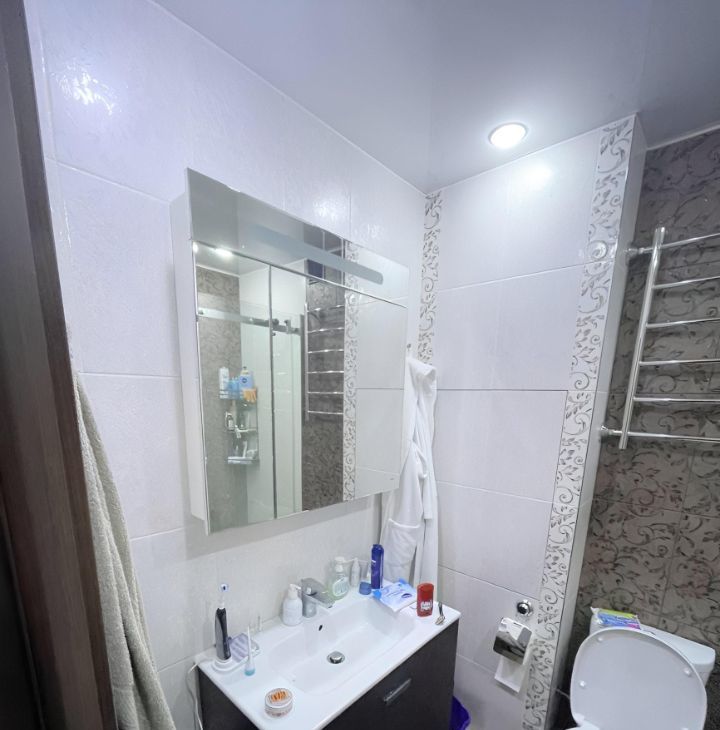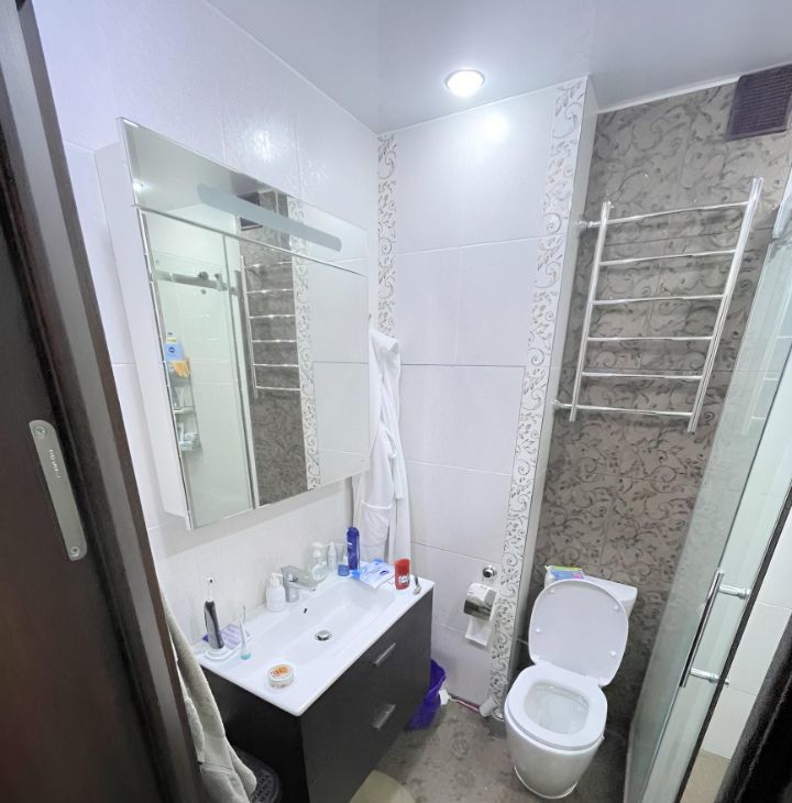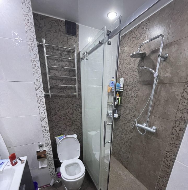 Санузел совмещенный, выполнен в современном стиле с просторной душевой кабиной.