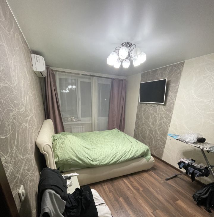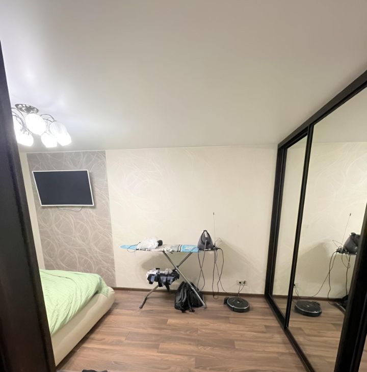 Отдельная спальная комната, с современно остекленным балконом. В комнате, большой встроенный шкаф, кровать, прикроватная тумбочка, телевизор.