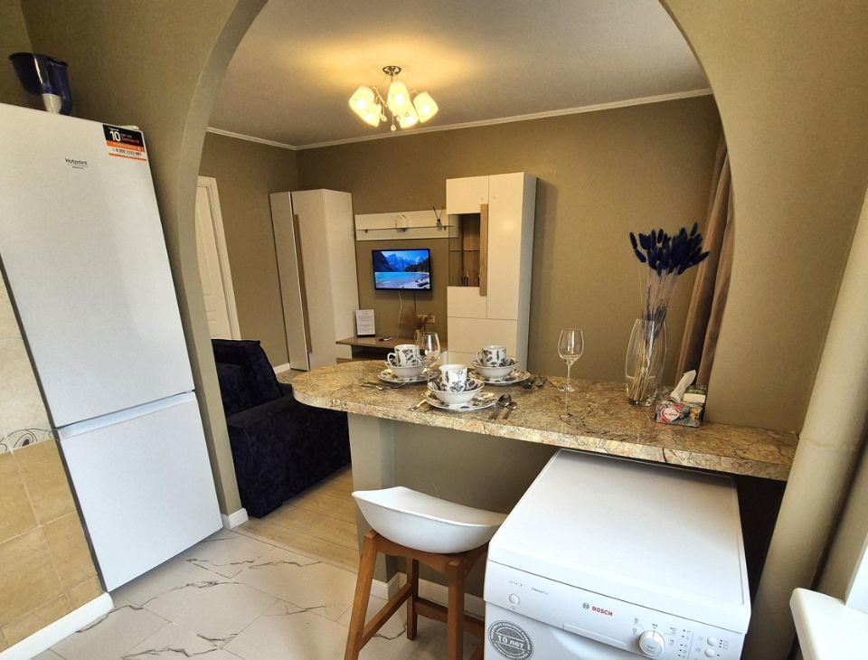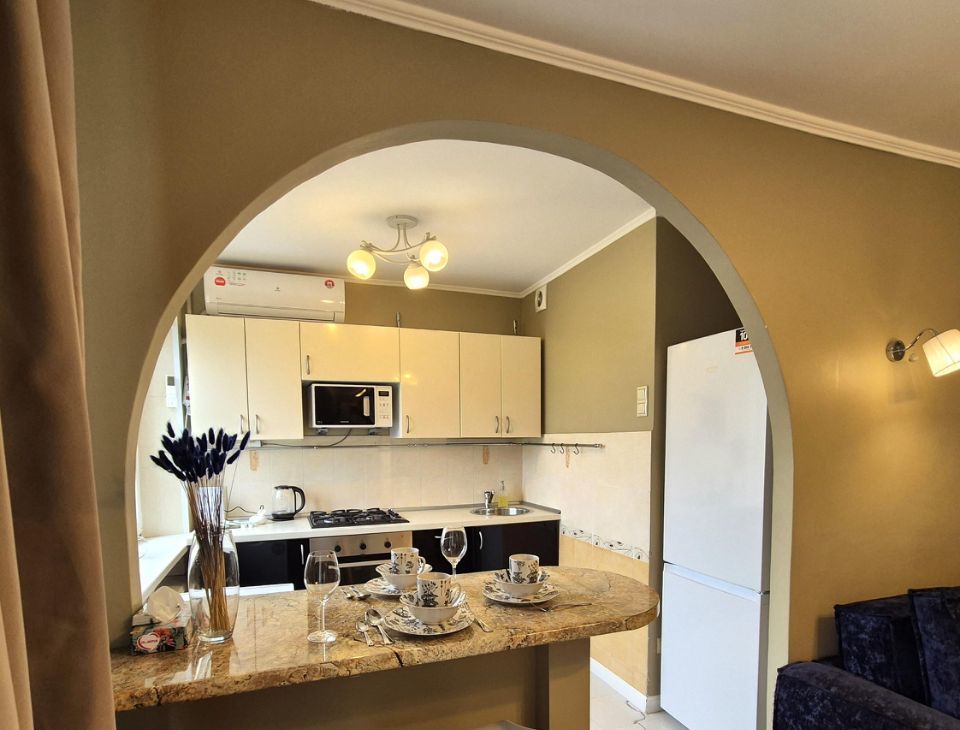 В кухне газовая плита, духовка, посудомойка, вместительный холодильник с морозилкой, хорошая посуда, бокалы для вина, чайник, микроволновка, мини бар. Гостям бесплатно предоставляется чай, бутилированная вода, сахар, сливки.