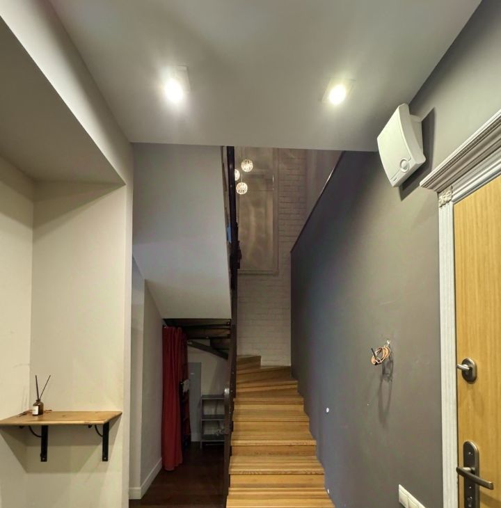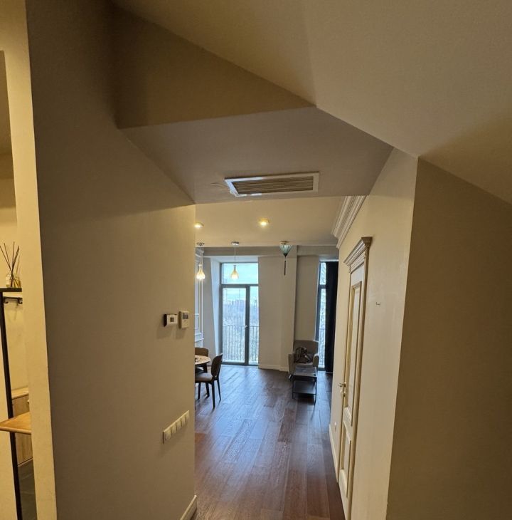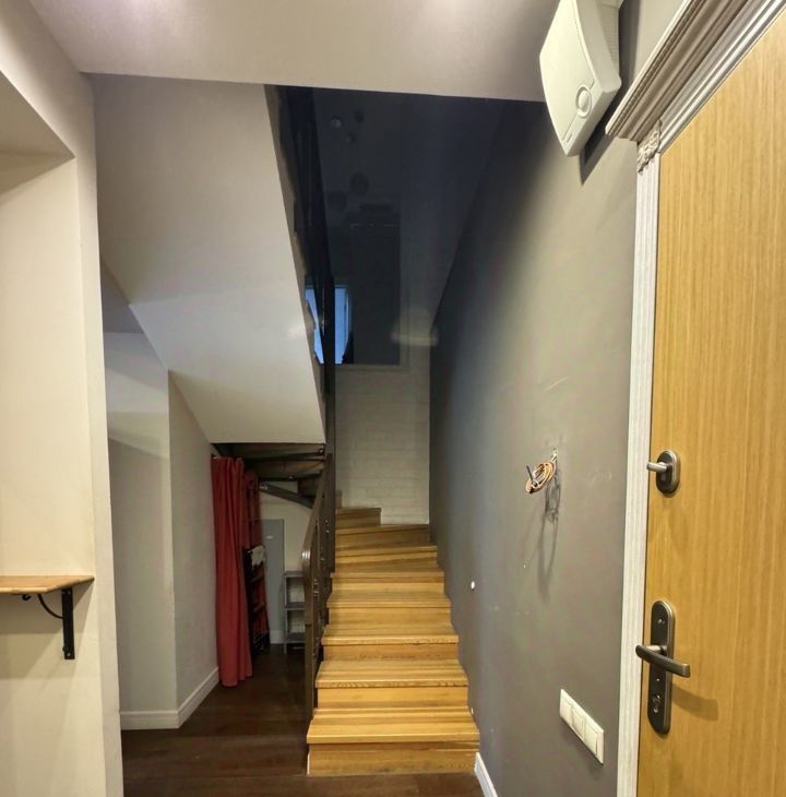Уютная светлая двух комнатная квартира в тихом жилом районе недалеко (10 минут пешком) от станций метро Октябрьское поле и МЦК ул Зорге. В квартире два этажа. Первый этаж прихожая, гостиная - кухня с высотой потолка 5 метров, санузел. Второй этаж - спальня, ванная комната и гардеробная. В гостиной дровяной камин. В квартире встроенная вентиляция с канальными кондиционерами. Вся техника: кухня (индукционная плита), холодильник, посудомойка, стиральная машина с сушкой