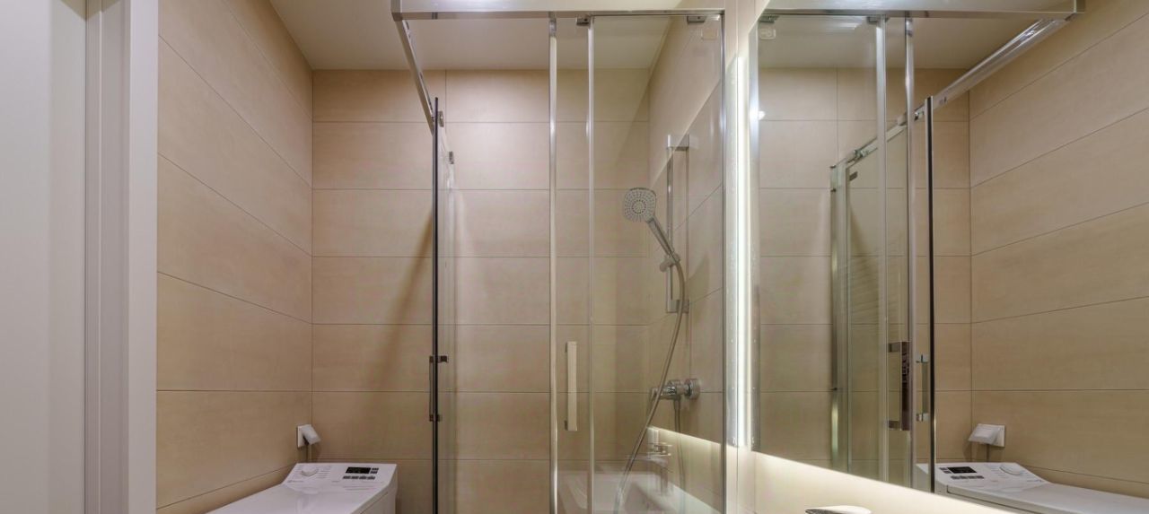 - двуспальная кровать с прикроватными тумбами и шкафом; В квартире один совмещенный санузел с душевой кабиной, стиральной машиной, раковиной с зеркальной подсветкой.