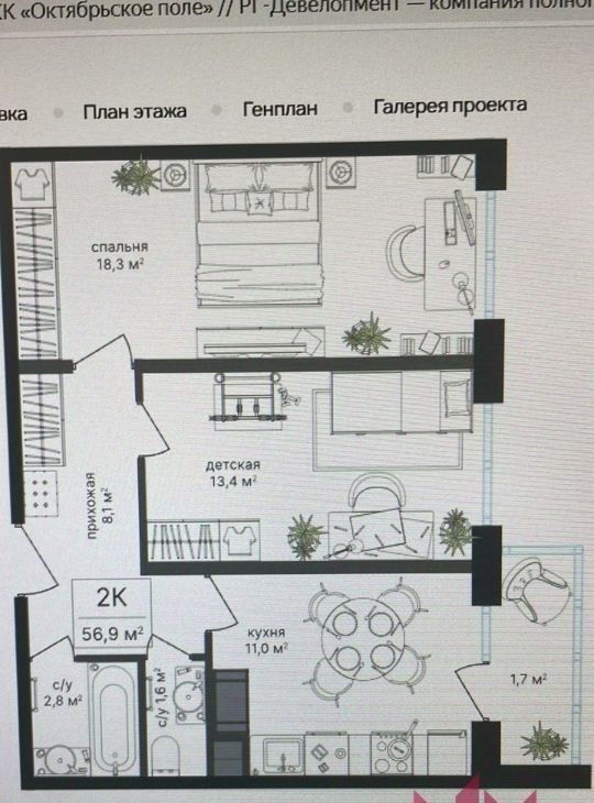 Id 55309. Сдается просторная и светлая квартира ЖК Октябрьское поле.