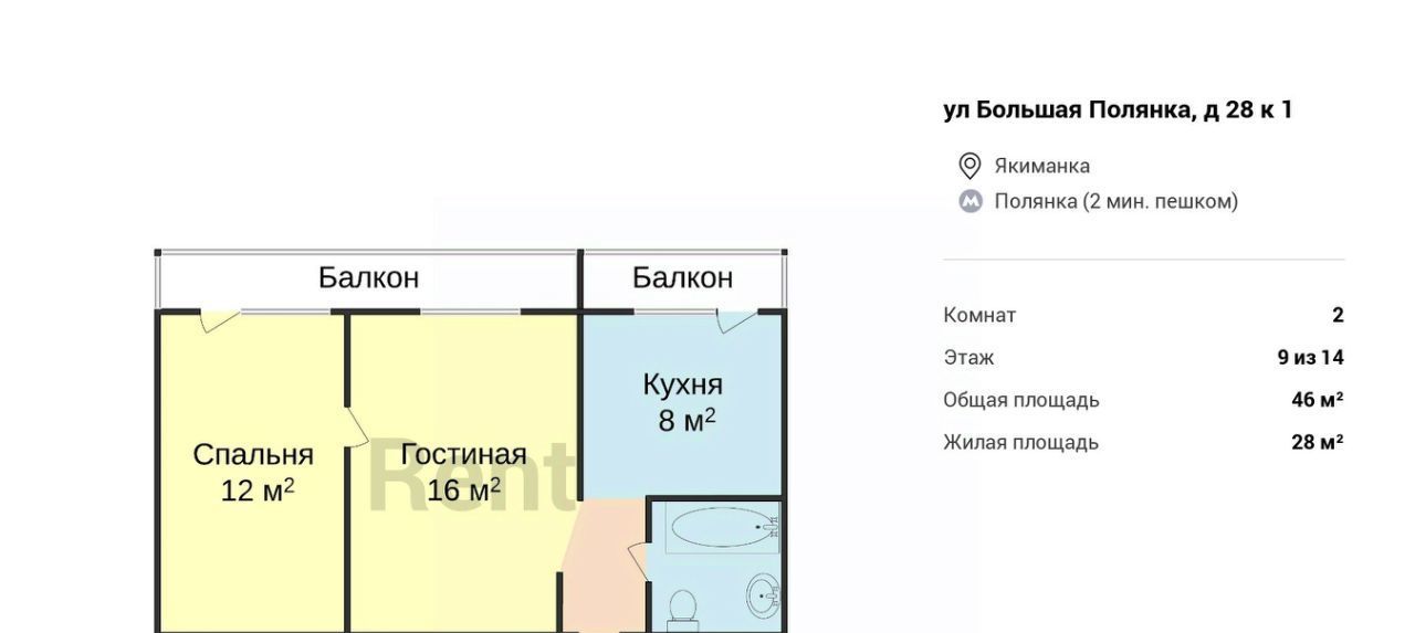 2-к кв. Москва ул. Большая Полянка, 28к1 (46.0 м²)
