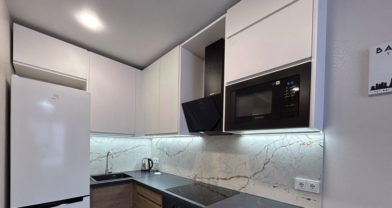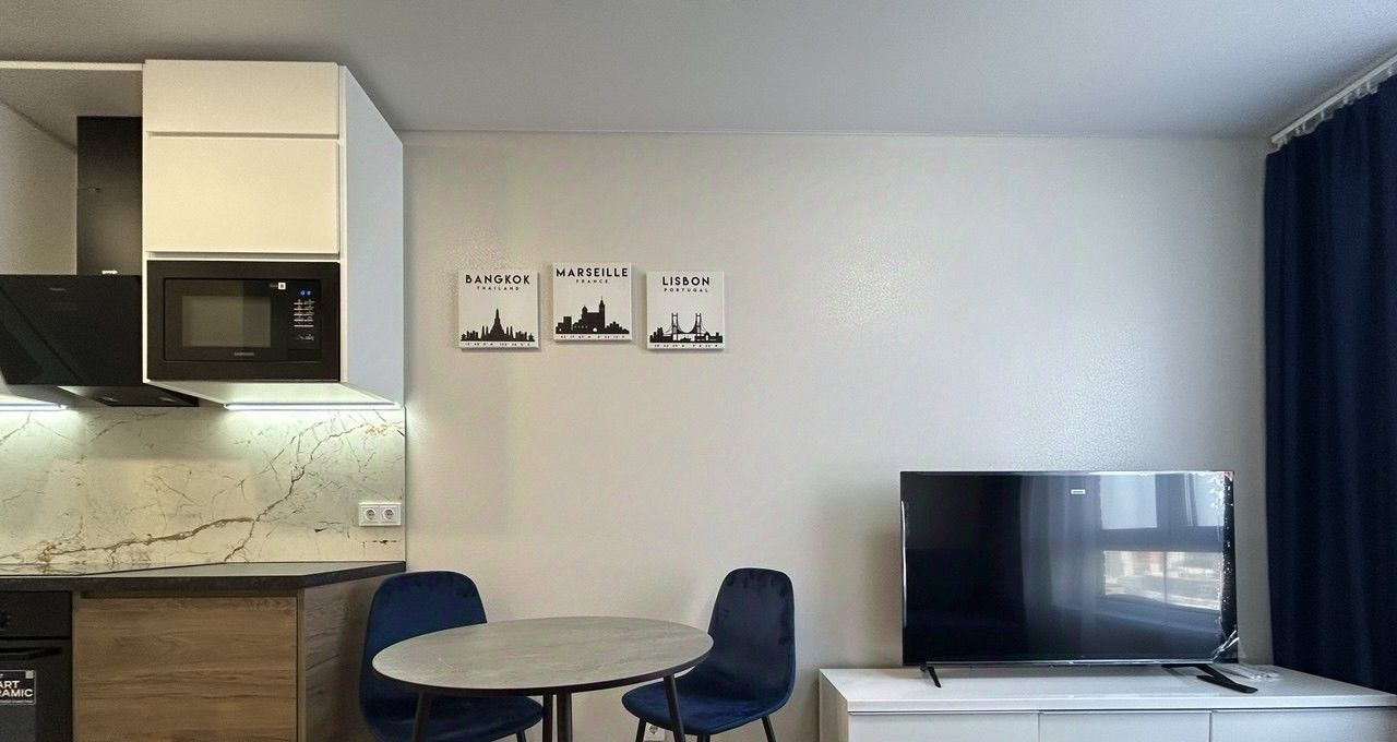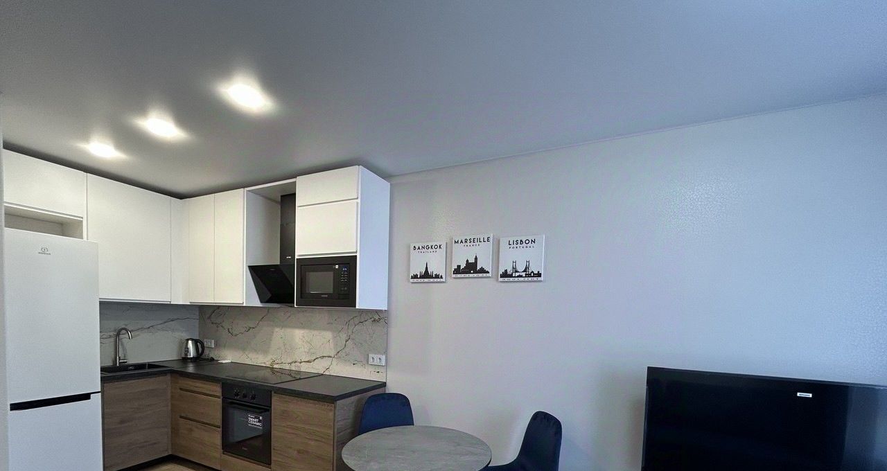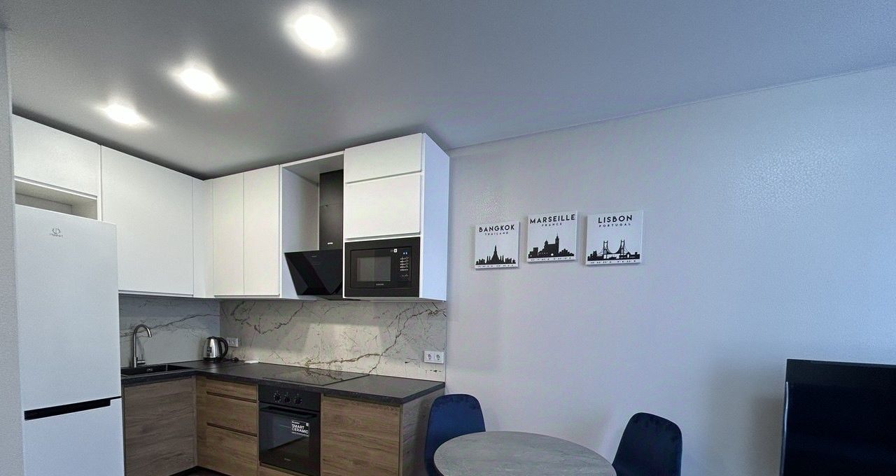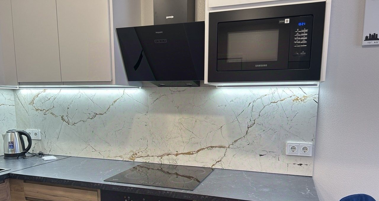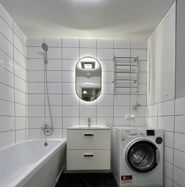 В квартире есть все необходимое для комфортного проживания: современная мебель на кухне и в комнатах, а также полный комплект техники, включая холодильник, телевизор и стиральную машину. Ванная комната оборудована ванной. Планировка квартиры продумана до мелочей, чтобы сделать ваше пребывание максимально комфортным.
