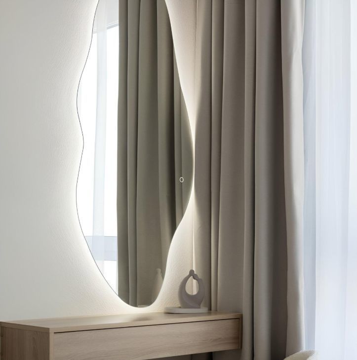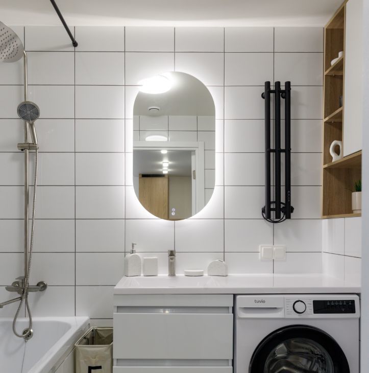 санузел: ванна, зеркало с подсветкой, стиральная машина.