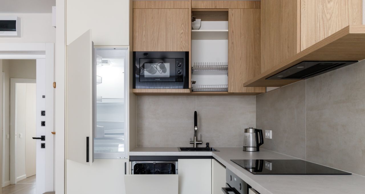 Большой кухонный гарнитур- с встроенным холодильником, посудомойкой, вытяжкой, варочной поверхностью, духовым шкафом и свч.