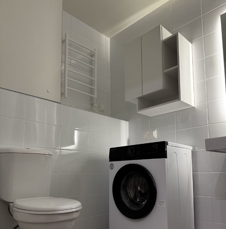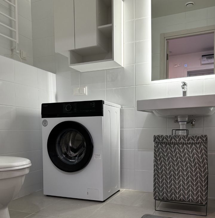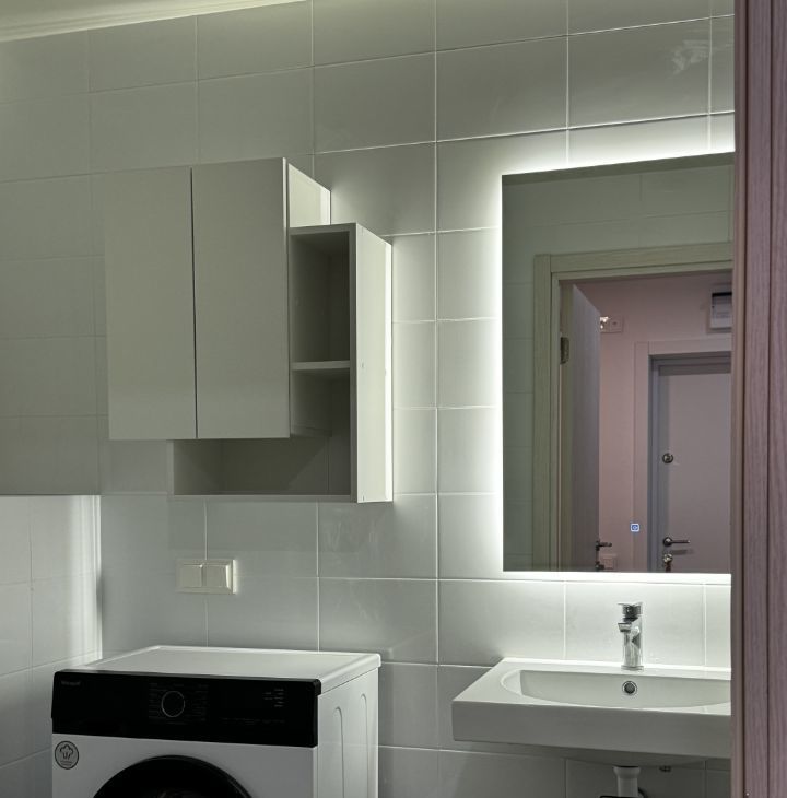 Санузел: стиральная машина, полотенцесушитель, шкаф для вещей, зеркало, полка.