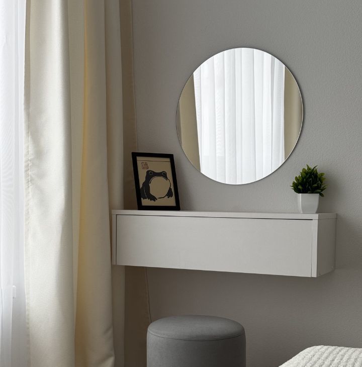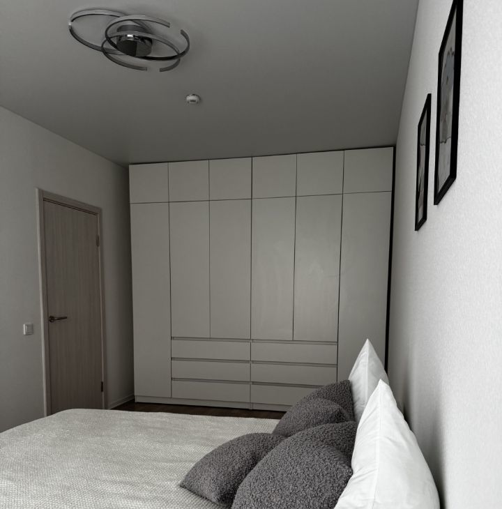 Спальня: большая кровать (1.8м) с ящиками, тумбочки, вместительный шкаф (3м) и туалетный столик с зеркалом.