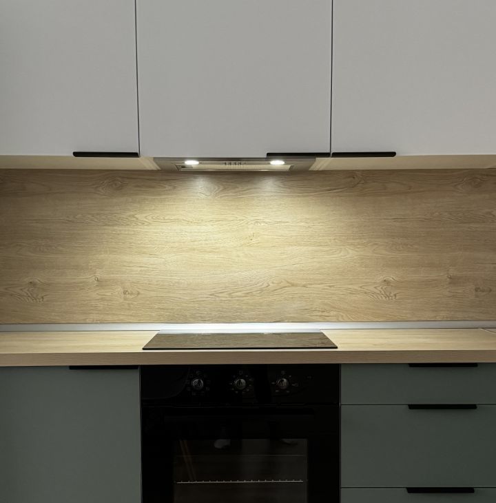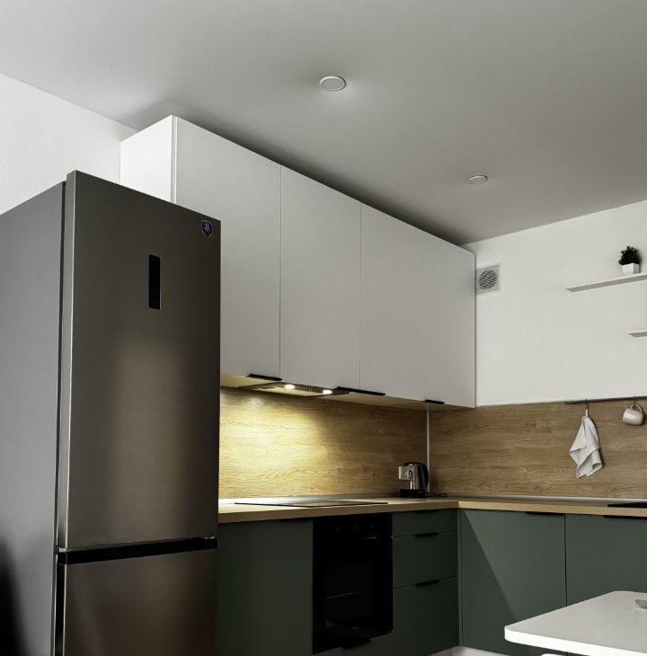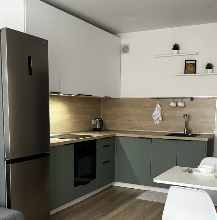 Кухня-гостиная: современный гарнитур, индукционная панель, духовой шкаф, вытяжка, большой холодильник. Для приёма гостей: диван-кровать, обеденный стол на 6 человек, телевизор на поворотном кронштейне (можно смотреть с любой точки комнаты), журнальный столик.