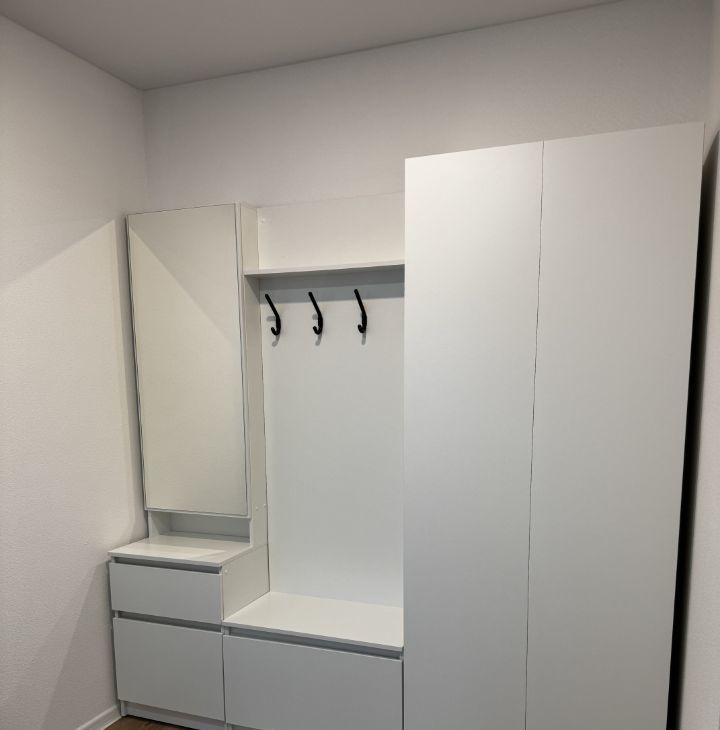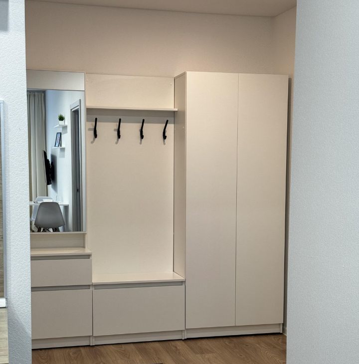 Прихожая: большой шкаф (2м) с зеркалом, штангой, полками и обувницей.