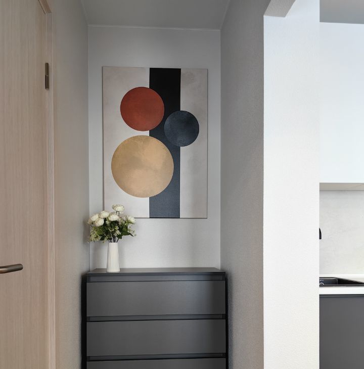 Полностью мебелирована и оборудована необходимой новой и современной техникой (посудомоечная машина, встроенный и тихий холодильник с инверторным двигателем, стиральная машина с сушкой). Есть гардеробная, максимально возможное количество мест для хранения.