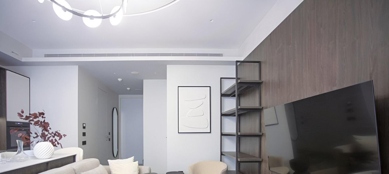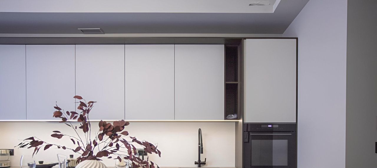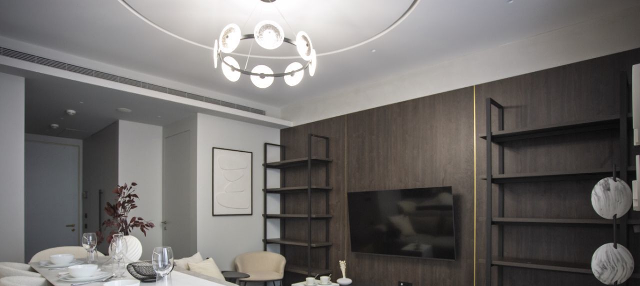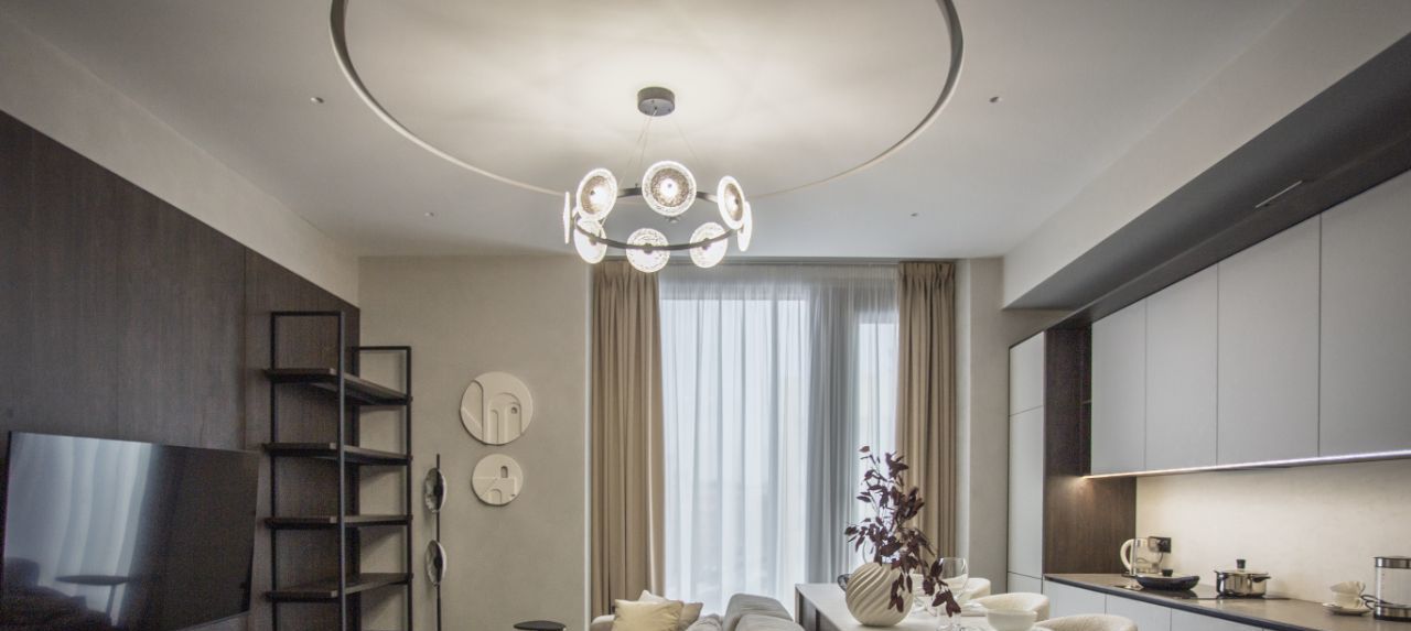 - Гостиную с кухонной и обеденной зонами, большой шкаф с подсветкой, телевизор, диван, кресло и стильный журнальный столик;