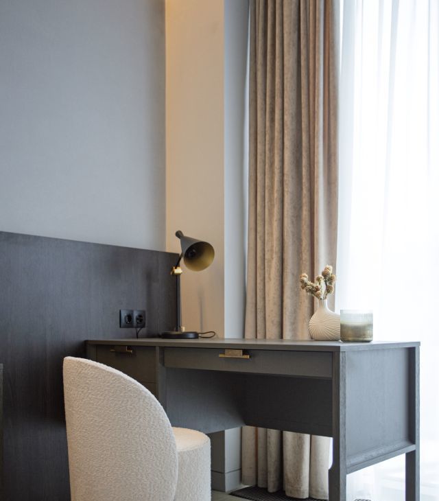 - спальню с телевизор, зеркало, рабочий стол, кресло, прикованные тумбы и пуфик;
