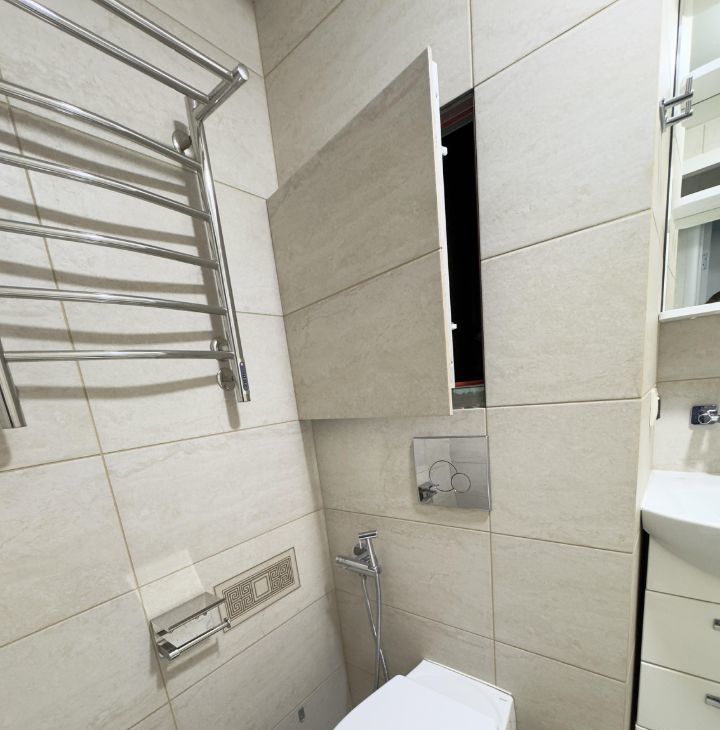 Полный комплект техники: кондиционер, стиральная и посудомоечная машины, холодильник, микроволновка. Установлены проточный водонагреватель и система фильтрации воды Аквафор. Все в рабочем состоянии.