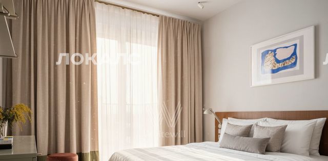 Планировка: гостиная с зоной кухни, спальня, кабинет, ванная комната, холл с гардеробной. В гостиной обустроена зона отдыха с уютным диваном, кабинет зонирован высокими прозрачными дверьми. Квартира полностью меблирована, установлена бытовая техника.