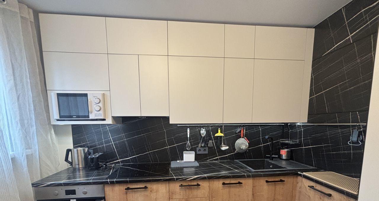 Кухонный гарнитур- мечта хозяйки! Удобные шкафы с доводчиками, встроенная техника: варочная панель, вытяжка, микроволновая печь, духовой шкаф. Установлен фильтр для питьевой воды. Двухкамерный холодильник, стиральная машина.
