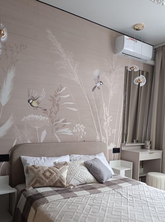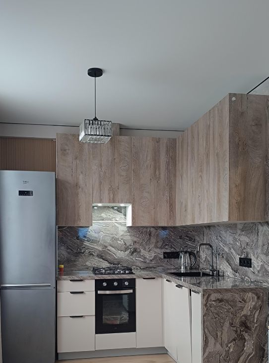 Двуспальная кровать, гардеробная в спальне, большой раскладной диван, кухонный гарнитур со встроенной техникой.
