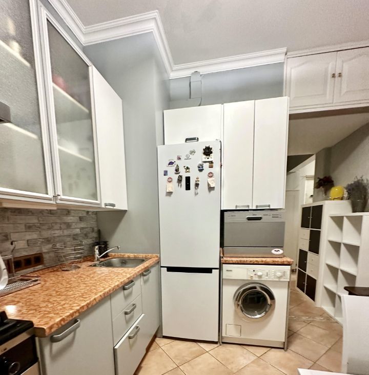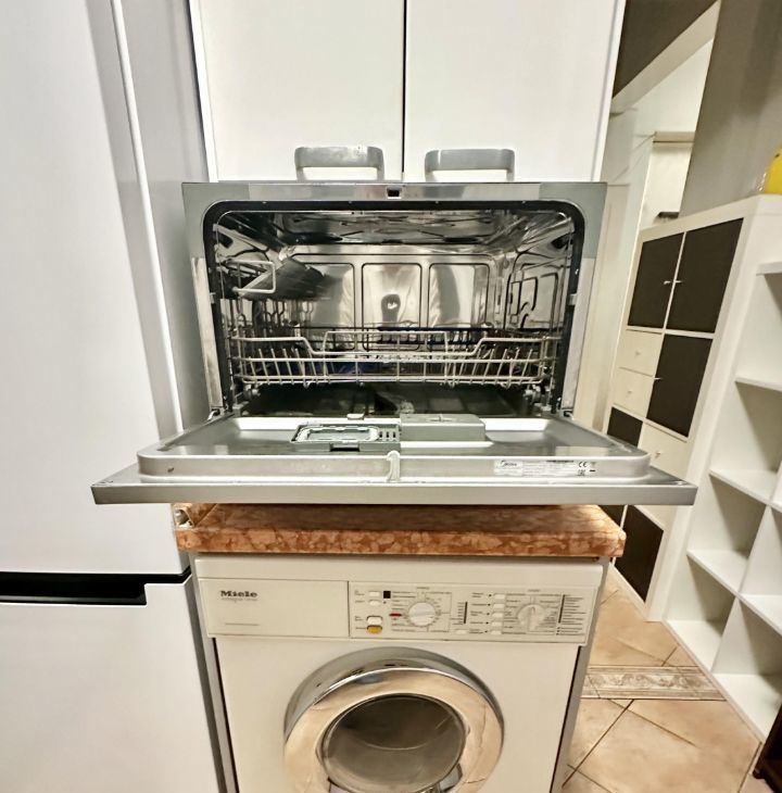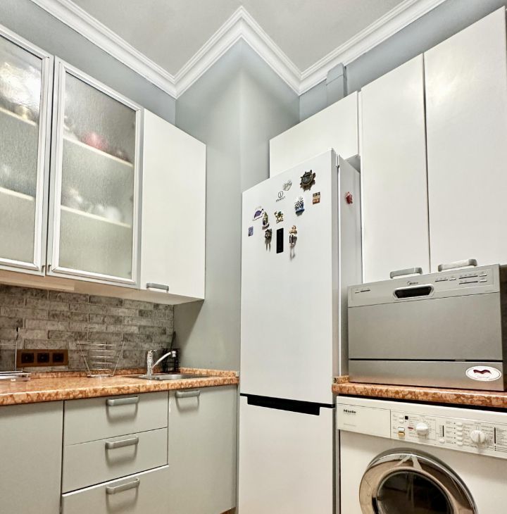 Квартира полностью укомплектована всей необходимой мебелью и бытовой техникой от ведущих производителей, включая посудомоечную машину, для комфортной жизни.