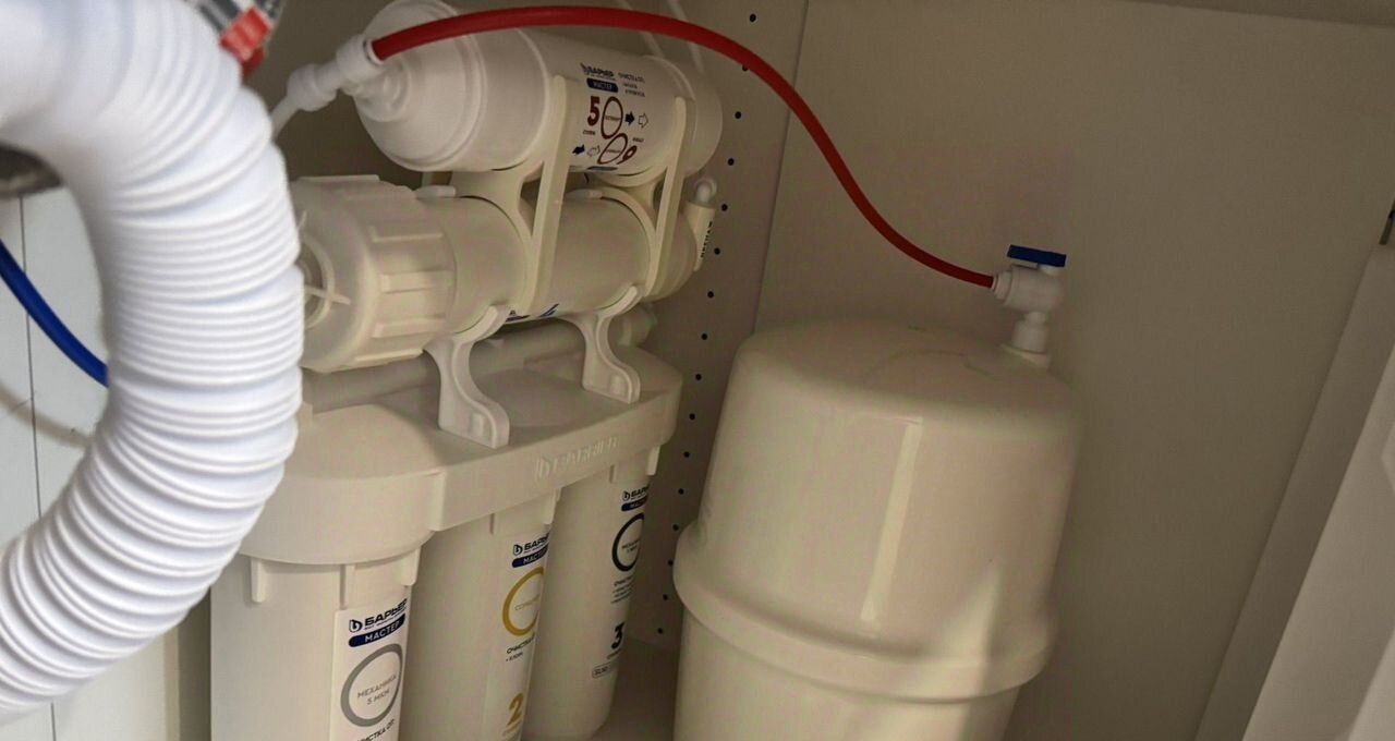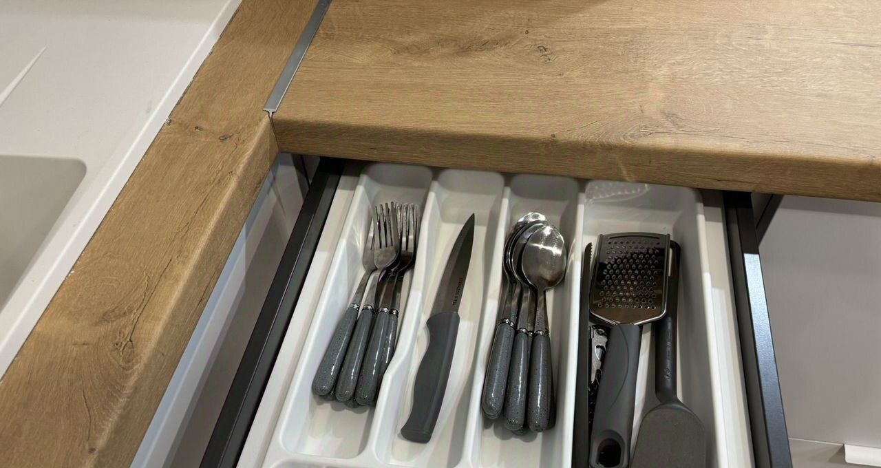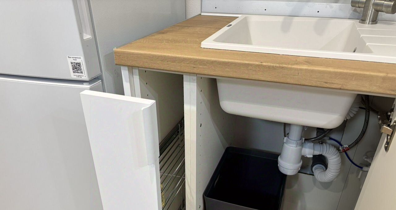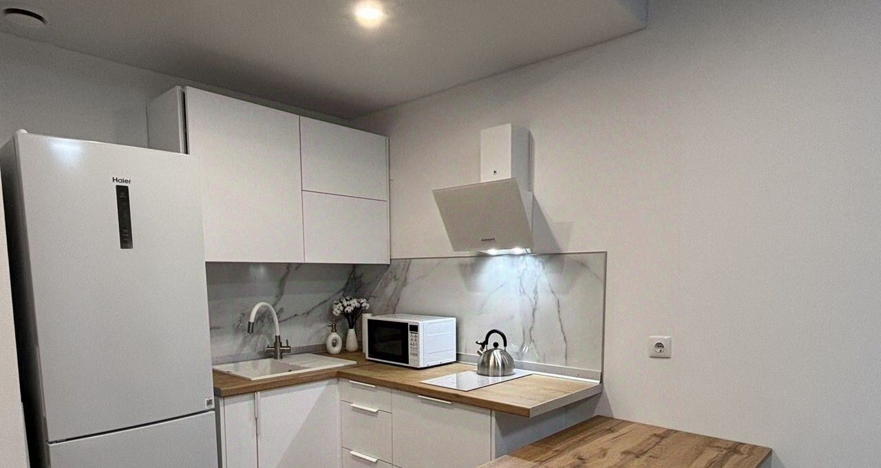 Вся необходимая техника только что установлена, все новое: стирально-сушильная машина, индукционная панель, микроволновка, чайник, холодильник, вытяжка, водяной фильтр, утюг