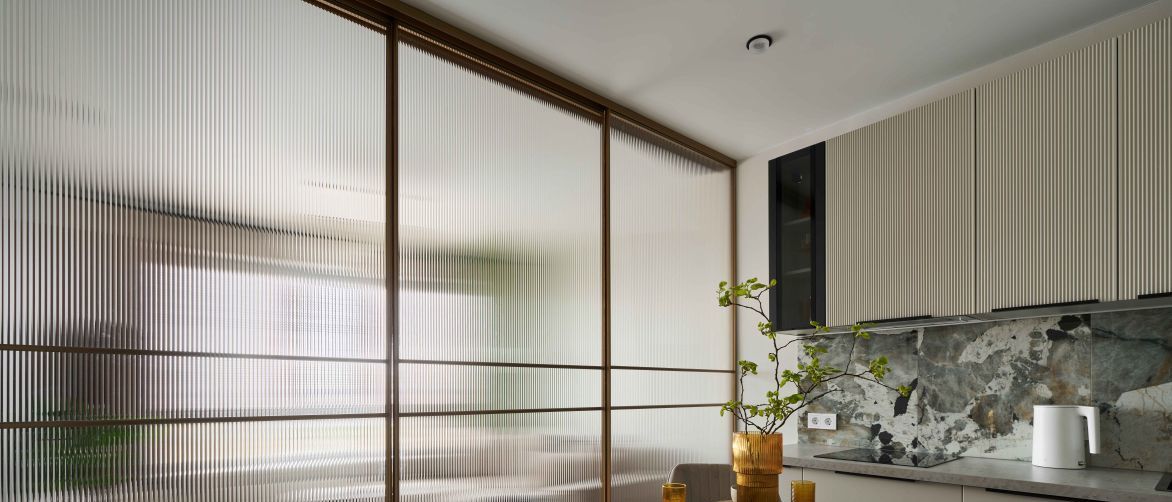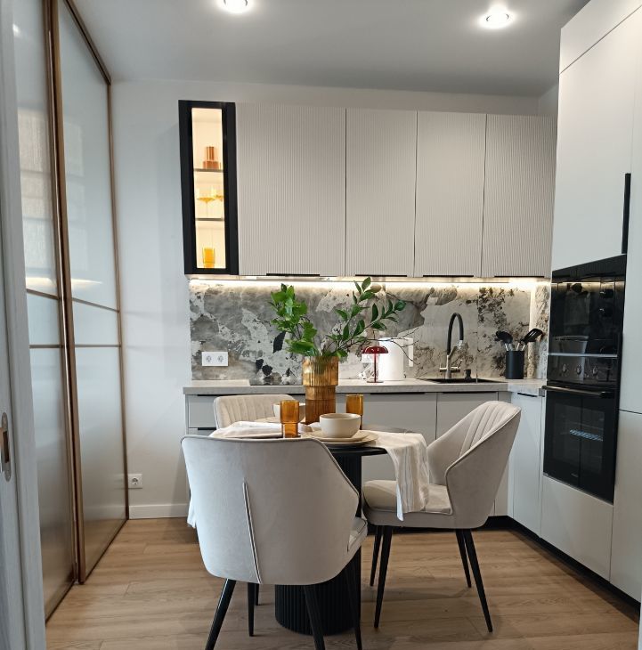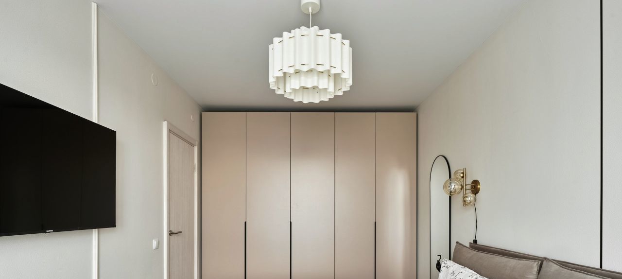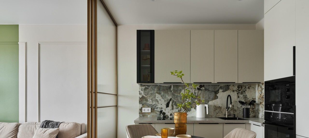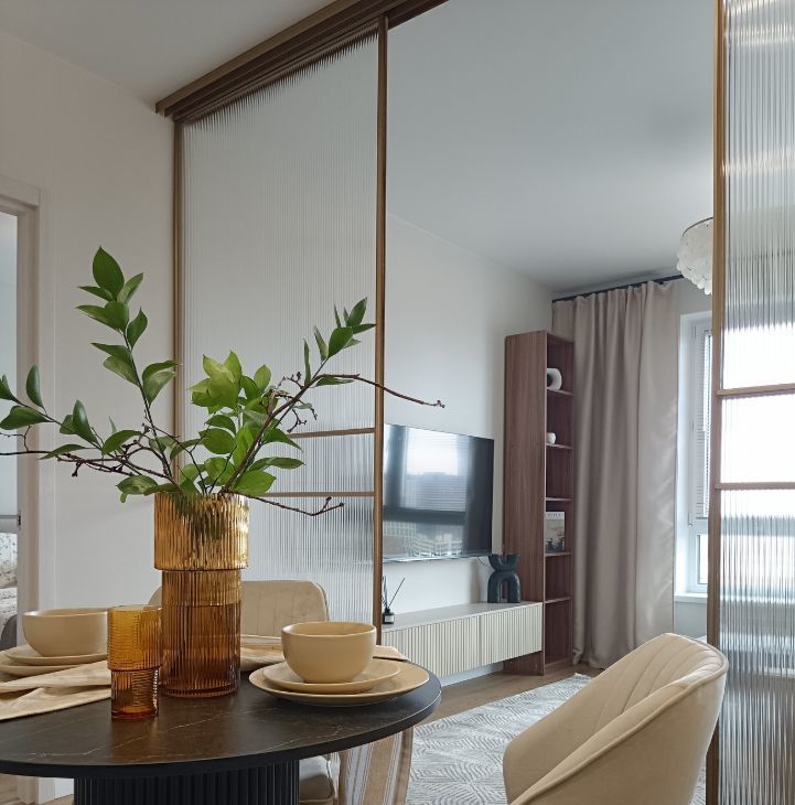 Спальня, гостинная и кухня, разделённая шикарной раздвижной перегородкой , что делает квартиру полноценной двушкой с 2-я комнатами для сна.