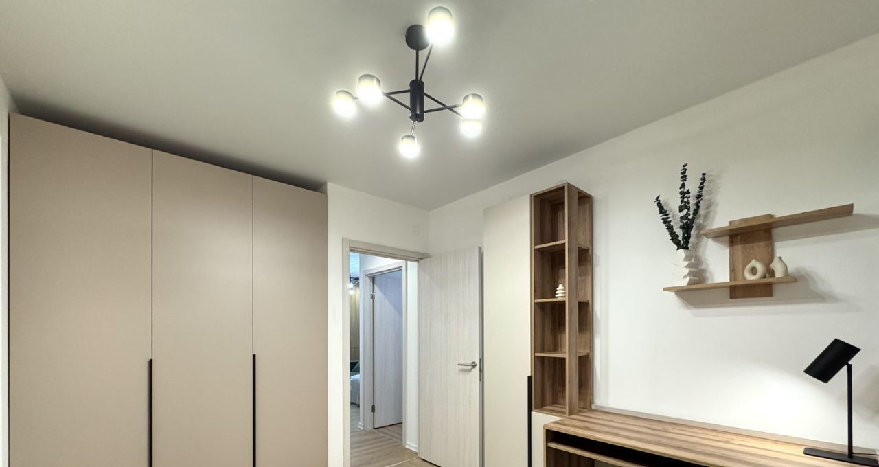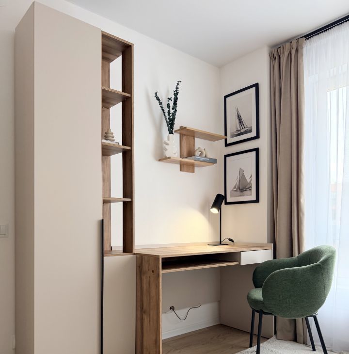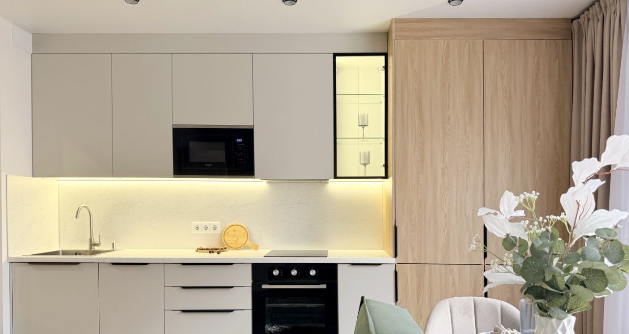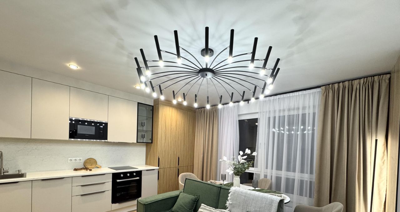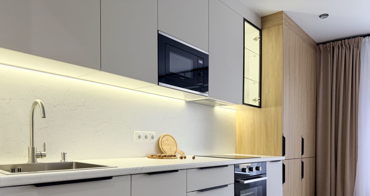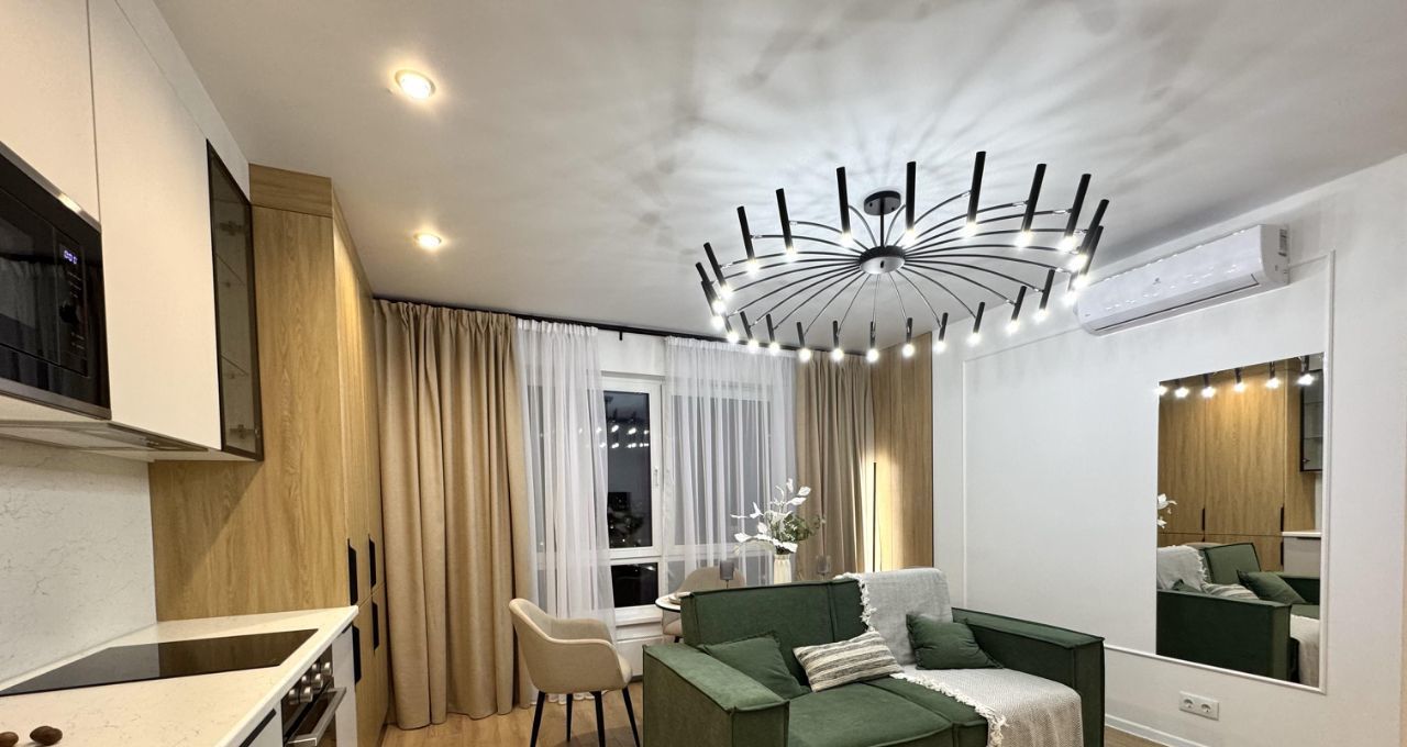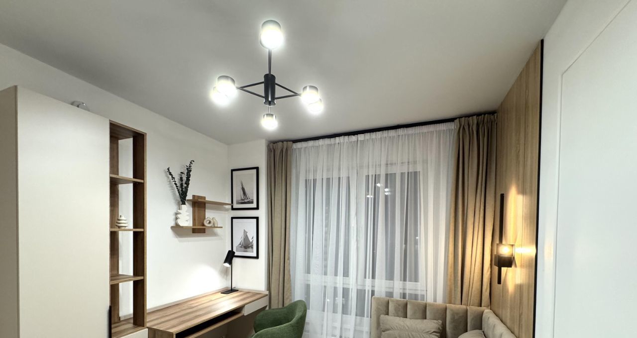2-х камерный холодильник, индукционная варочная панель, духовой шкаф, встроенная микроволновка, чайник, диван в кухне-гостинной, диван в кабинете, 3 больших вместительных шкафа (в кабинете, спальне и прихожей), 2-х спальная КРОВАТЬ с подъемным механизмом и дорогим ОРТОПЕДИЧЕСКИМ матрасом, рабочее место, туалетный столик, WI-FI.