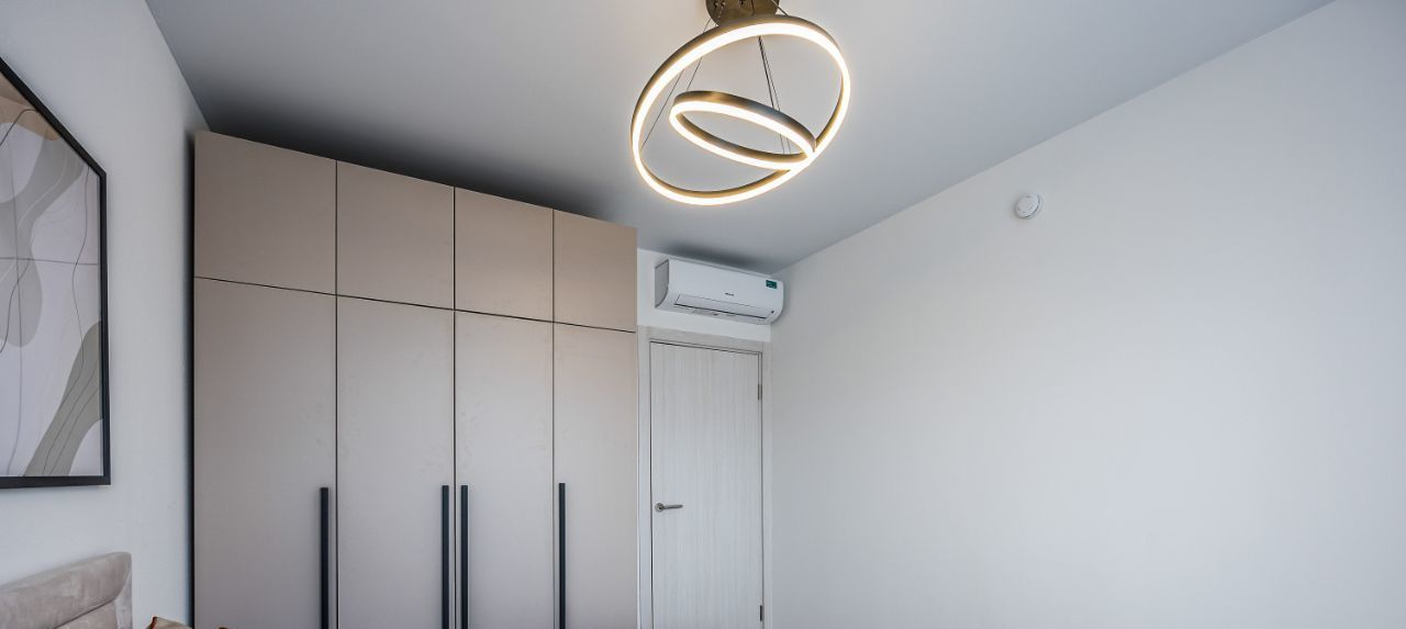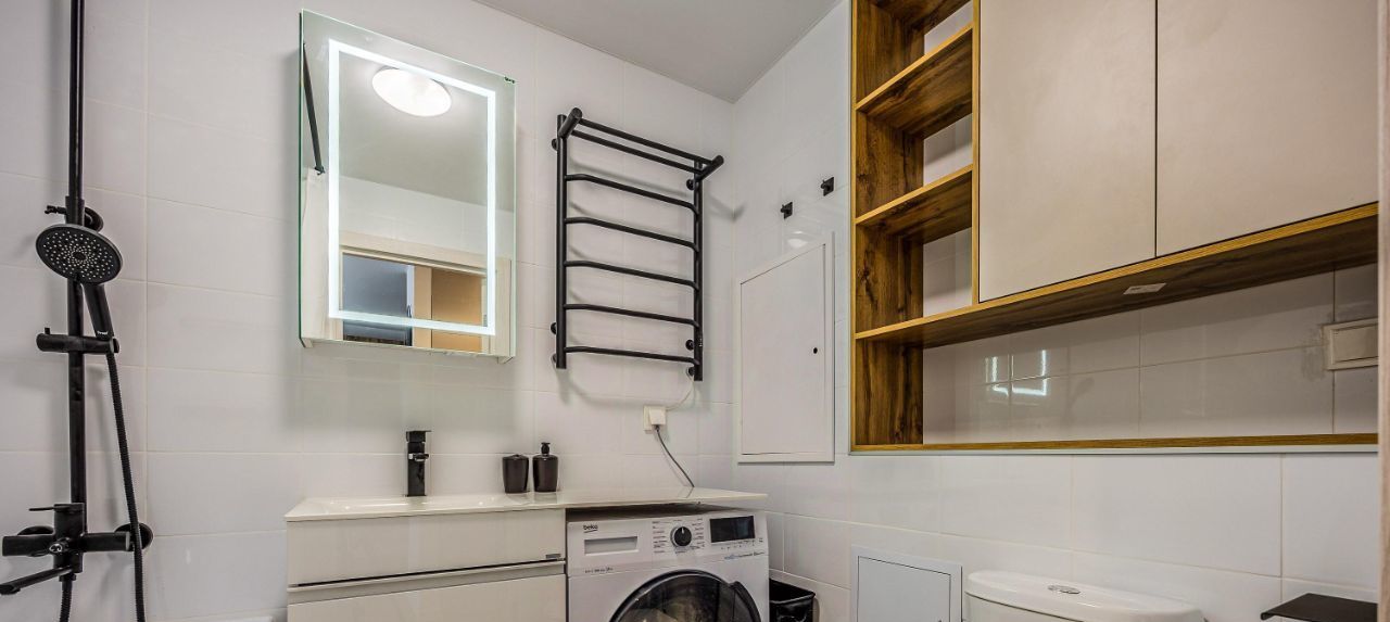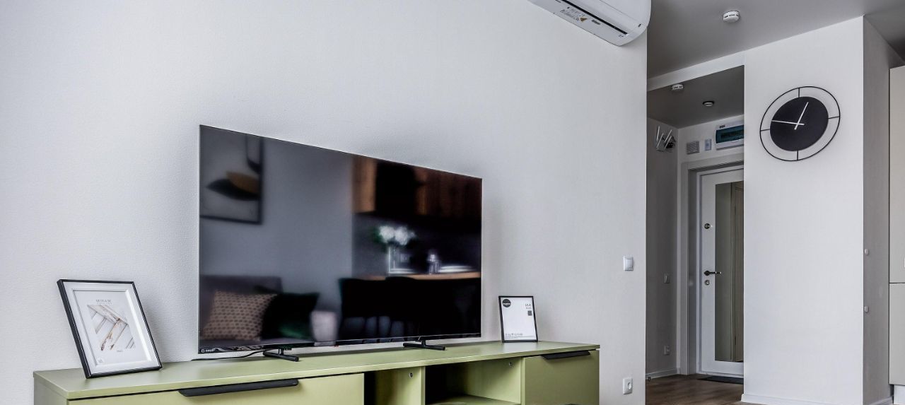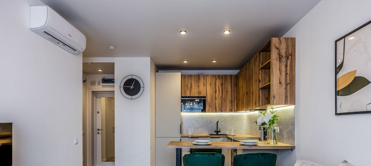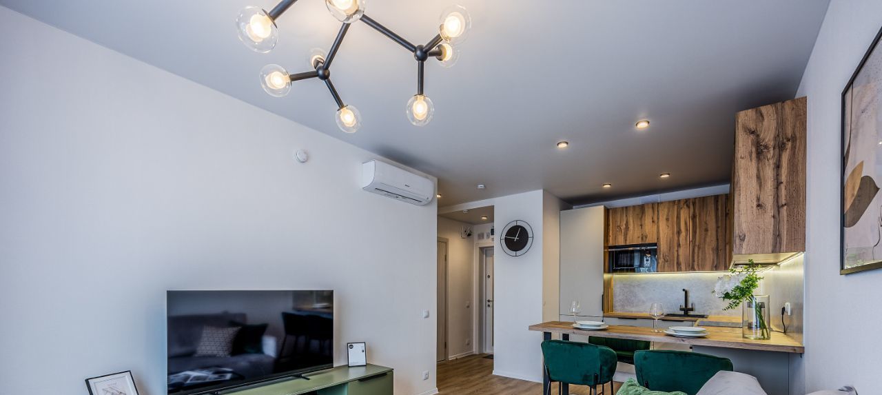 Вся необходимая техника - стиральная машина, духовой шкаф, индукционная плита, посудомойка, микроволновка, чайник, встроенный холодильник, вытяжка, кондиционер в каждой комнате.