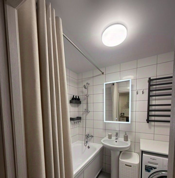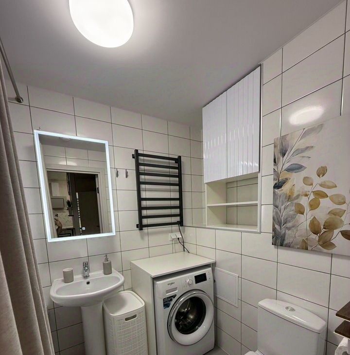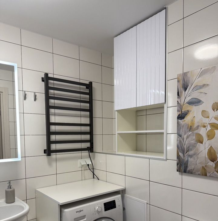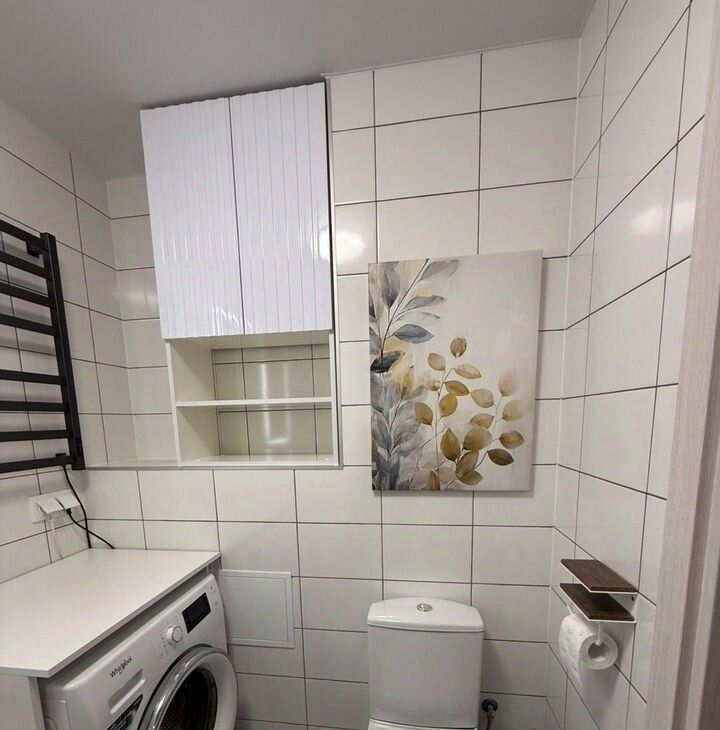 В квартире совмещенный санузел с ванной и стиральной машиной. Просторные шкафы обеспечат место для хранения вещей.