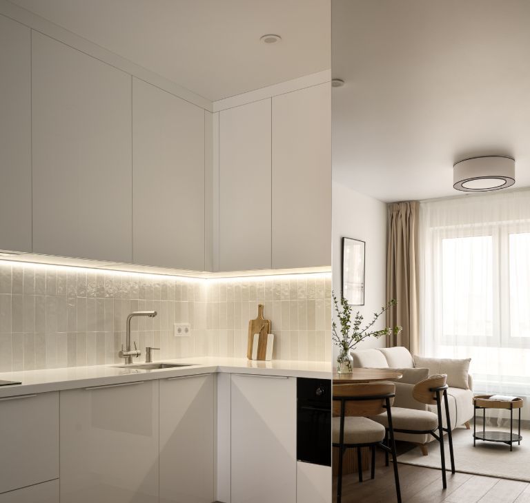 • кухня полностью укомплектована (холодильник, плита, духовка, посудомойка, вытяжка)