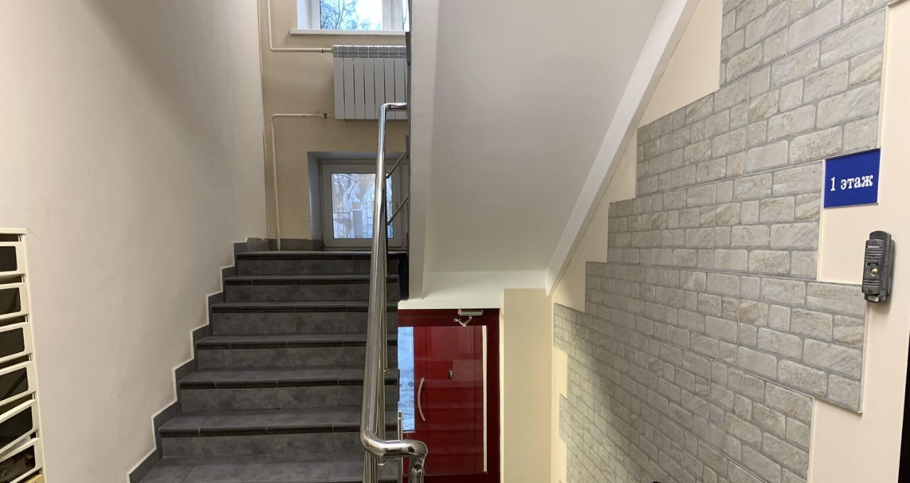 Чистая парадная. Ухоженный внутренний двор с детскими площадками и наземной парковкой для авто.
