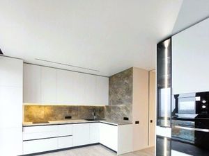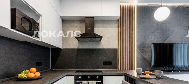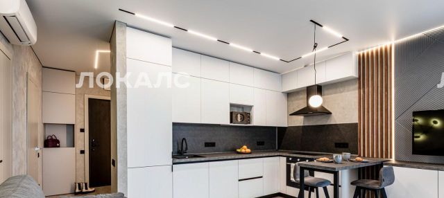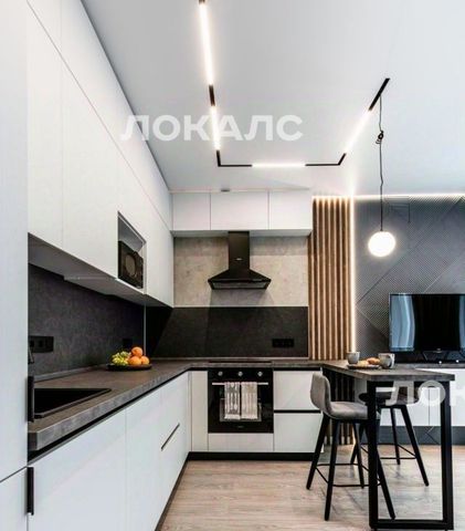 -кухня-гостиная, укомплектована максимальным арсеналом техники немецкой Graude: полноразмерная посудомоечная машина, встроенный холодильник, эл.плита, духовой шкаф, вытяжка. Установлены микроволновка, телевизор, встроенный фильтр с питьевой водой. Стильная барная стойка с высокими креслами