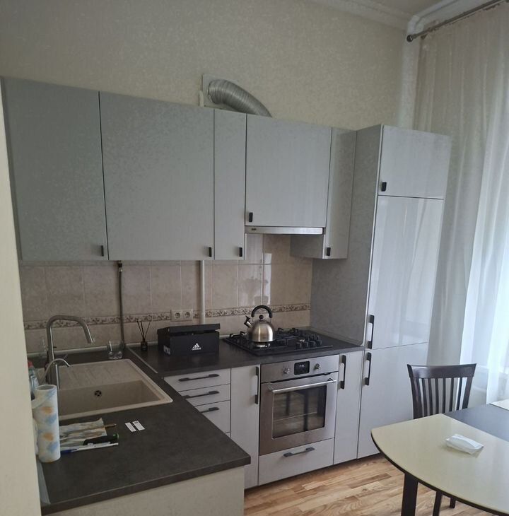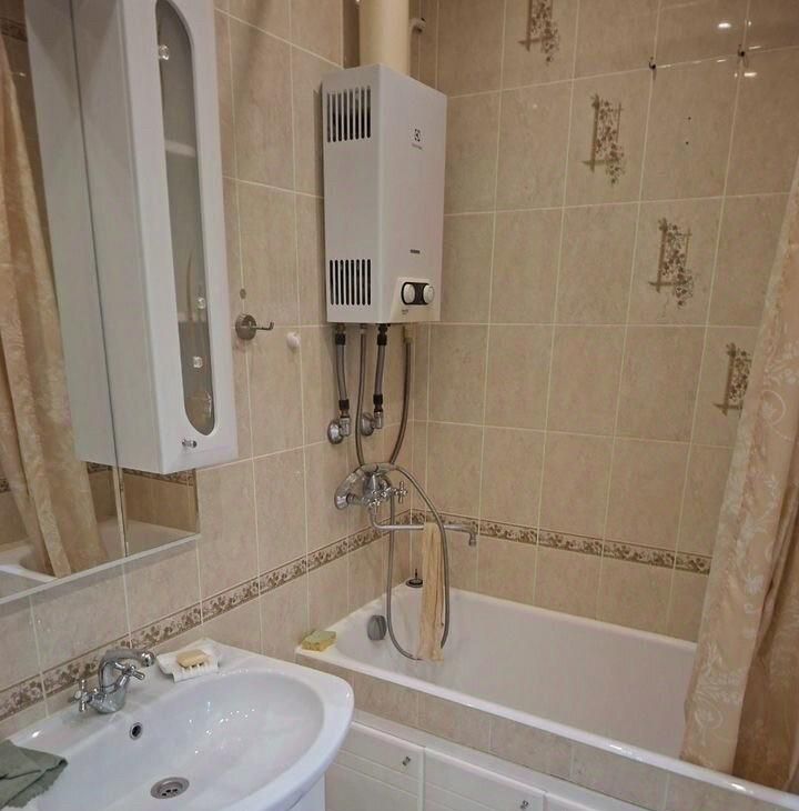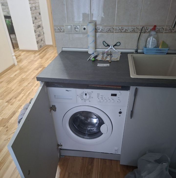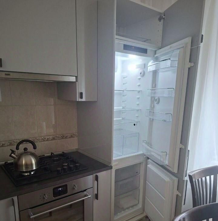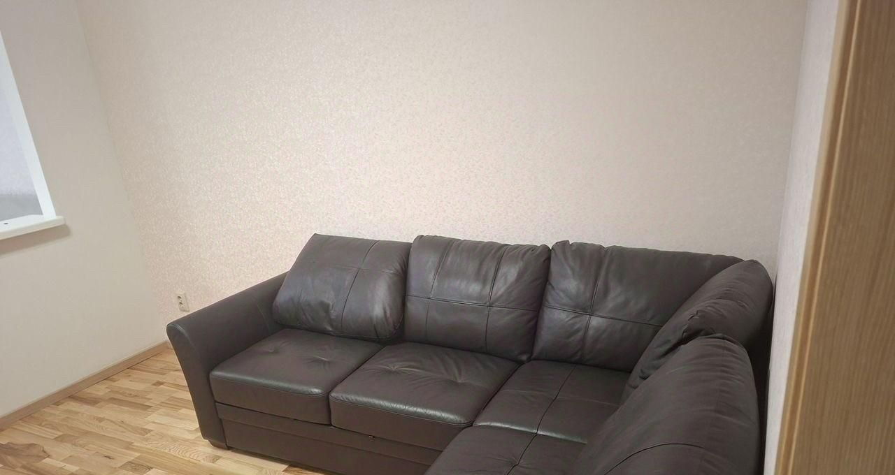 В комнате установлен вместительный шкаф-купе и удобный диван. Из мебели также имеется обеденный стол и стулья. В кухне современная бытовая техника: холодильник, варочная панель, духовой шкаф и стиральная машина. Санузел раздельный, оборудован ванной и стиральной машиной.