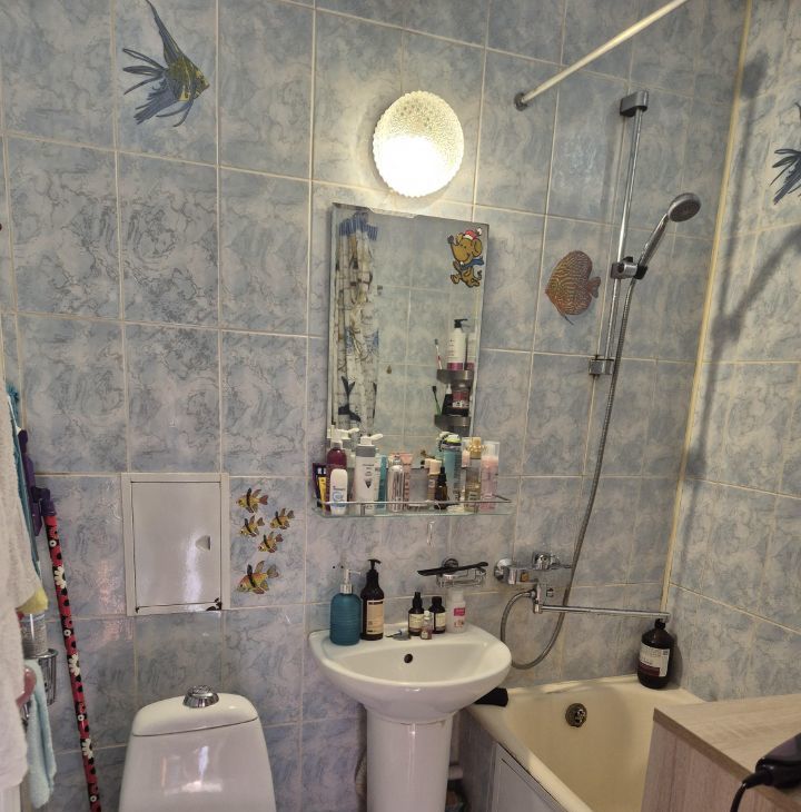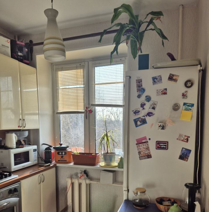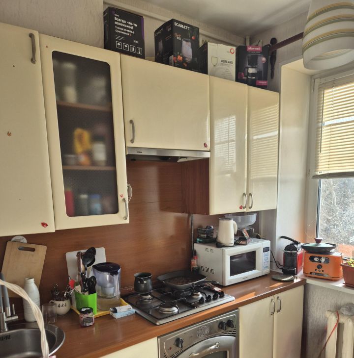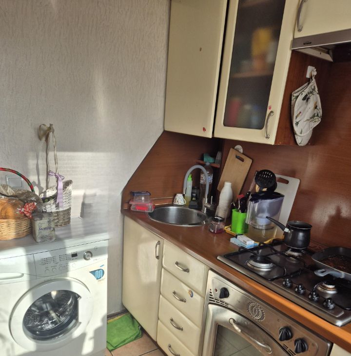 В квартире выполнен ремонт. Состояние среднее. Комнаты изолированные, санузел раздельный. Кухня площадью 6 м² оборудована необходимой бытовой техникой, включая телевизор и стиральную машину.