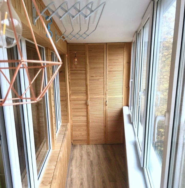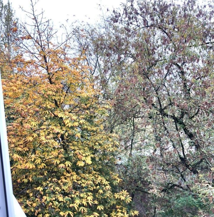 Большая застекленая лоджия с видом на тихий, зелёный двор.