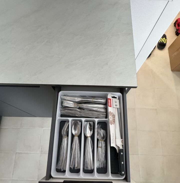Новые наборы посуды: вилки, ножи, ложки, кружки, тарелки (десертные и обеденные), пиалы, кастрюли и сковороды. Ничего не было ранее использовано.