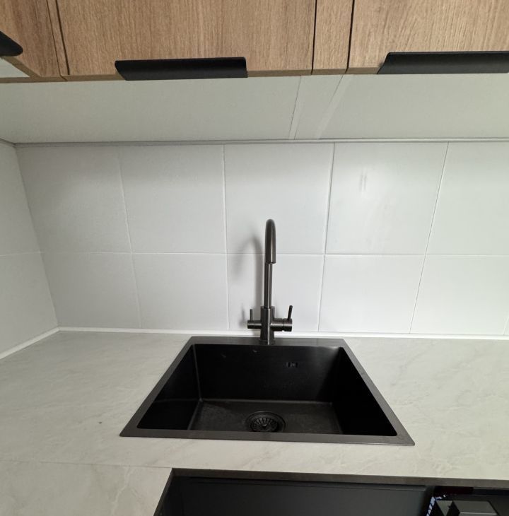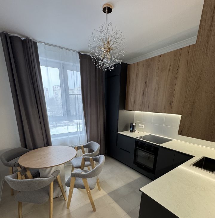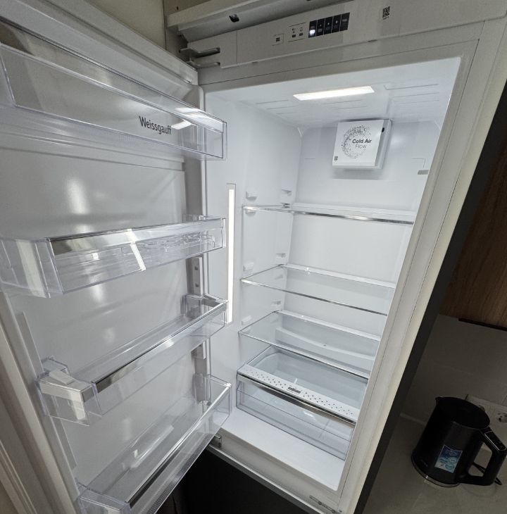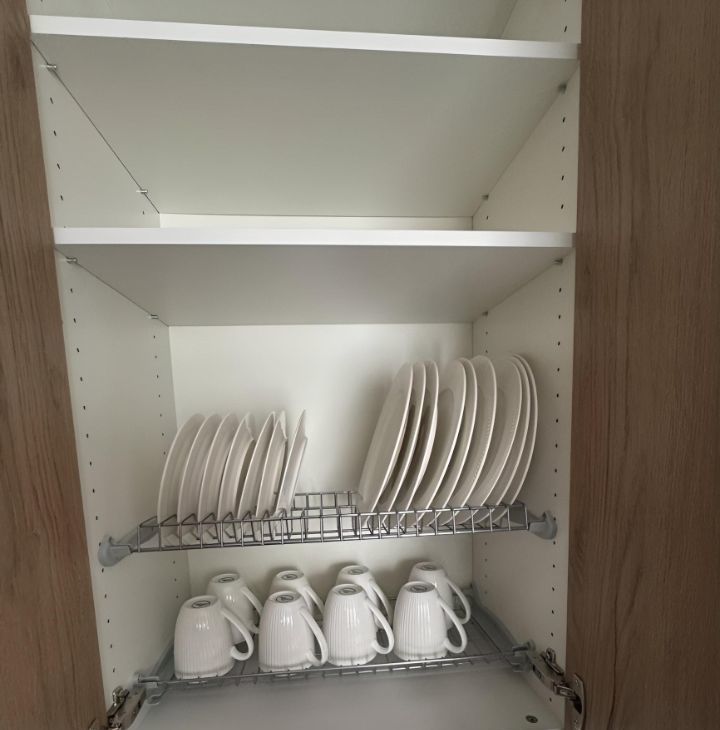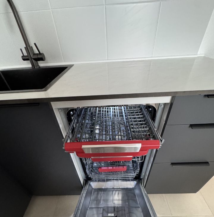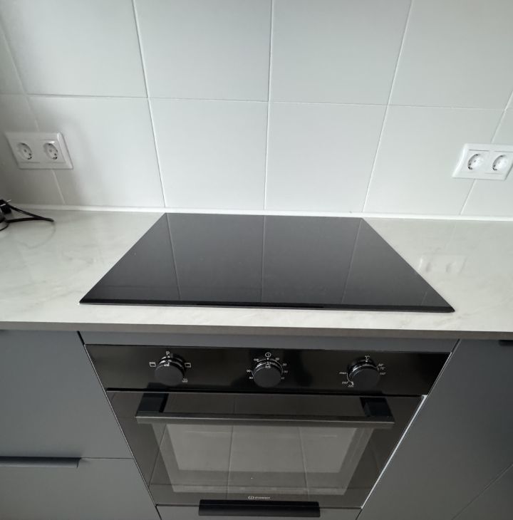 Имеются: встроенный холодильник (no frost), посудомоечная машина, вытяжка, духовой шкаф, индукционная плита, фильтр для воды, электрический чайник.