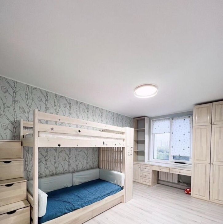 Детская: письменный стол со шкафами и двухъярусная кровать из натурального дерева.