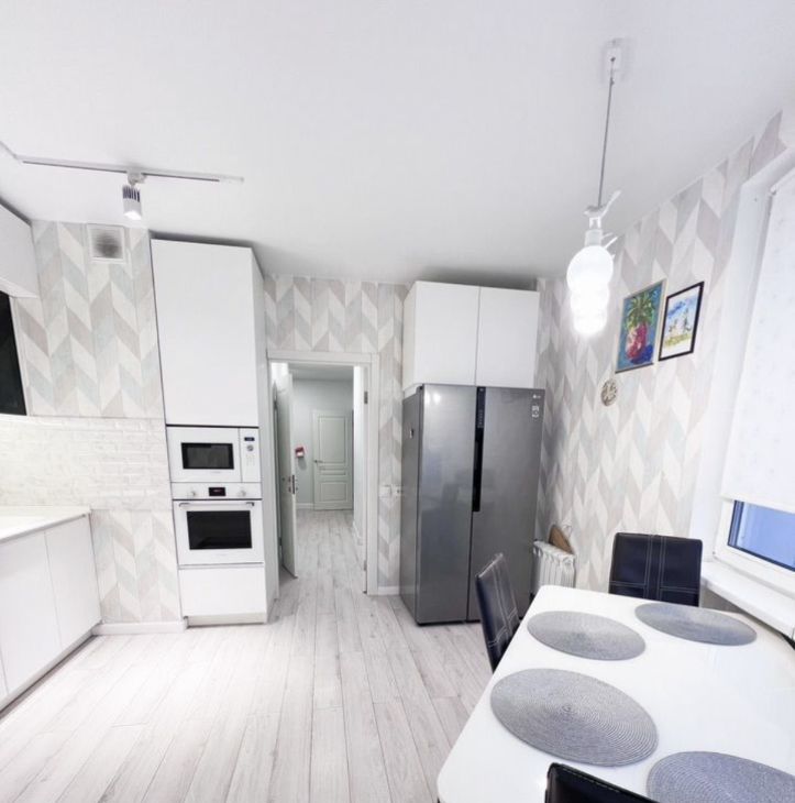 Кухня: холодильник Side by Side с двумя распашными дверьми, встроенный духовой шкаф и свч печь, посудомоечная машина, смарт телевизор.