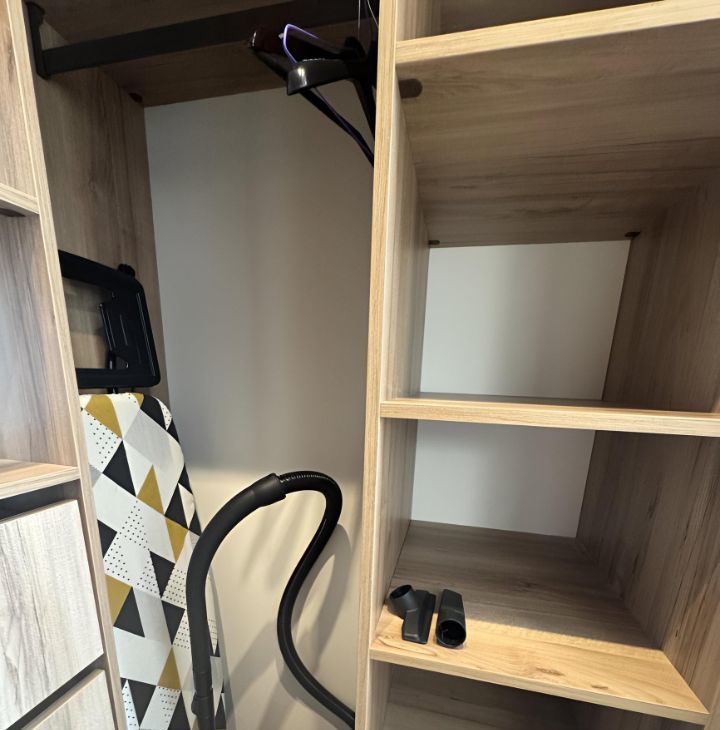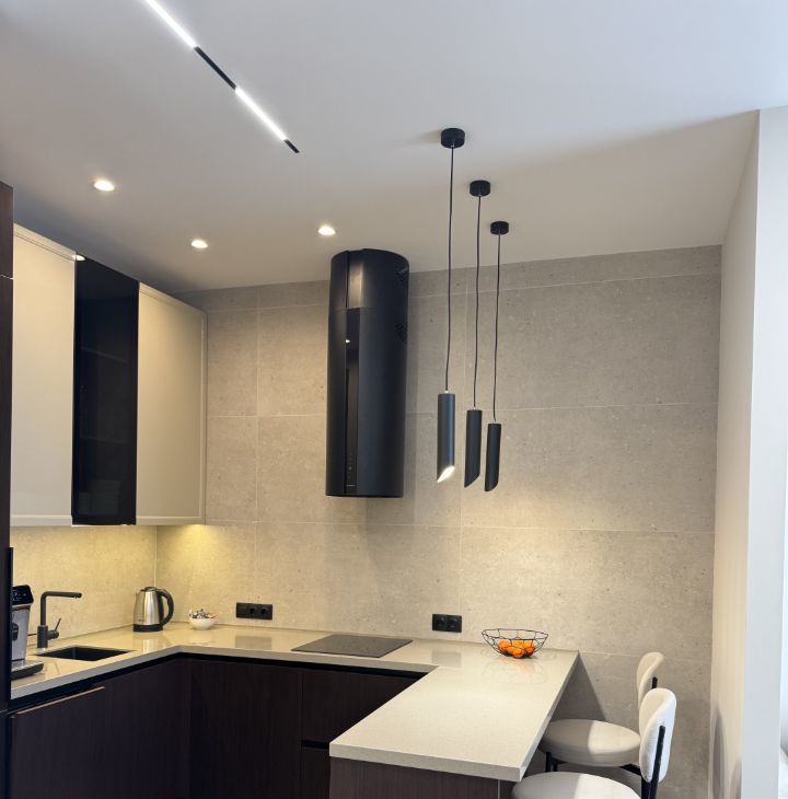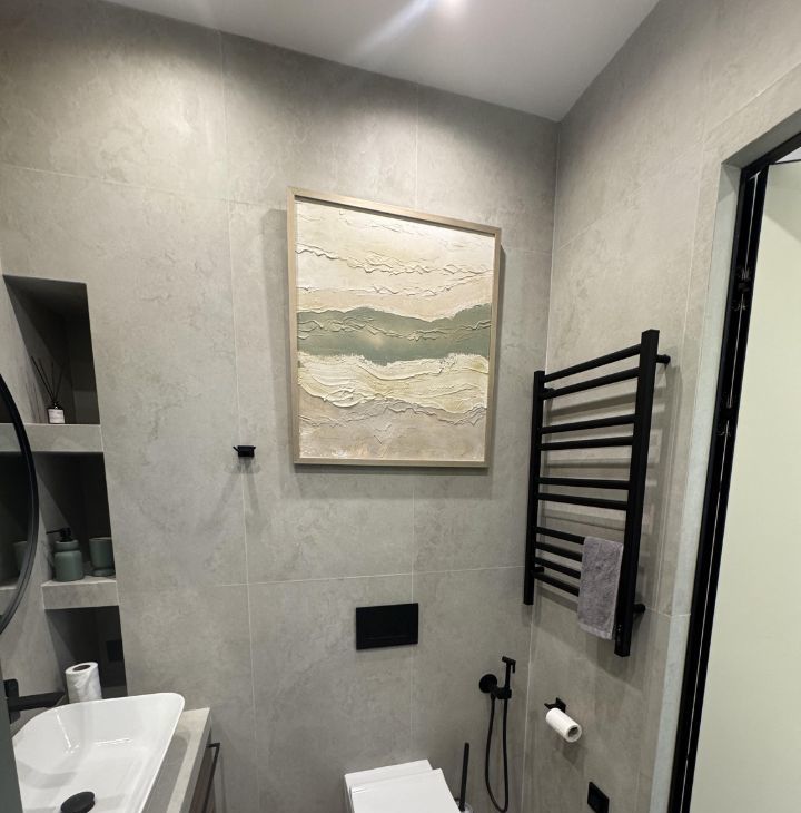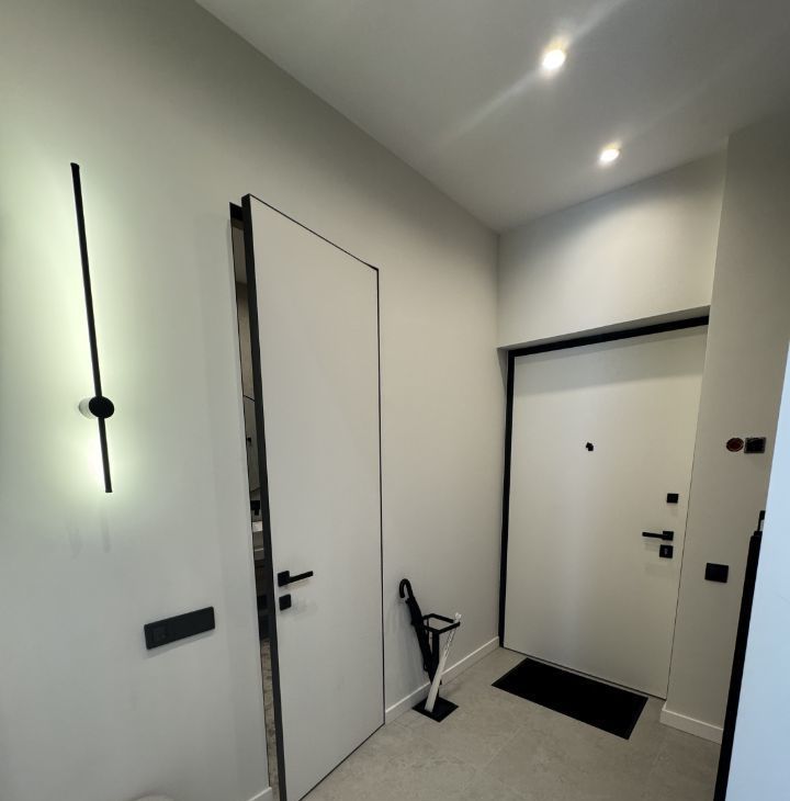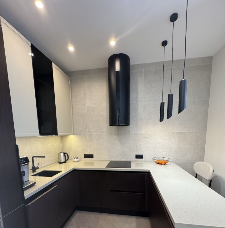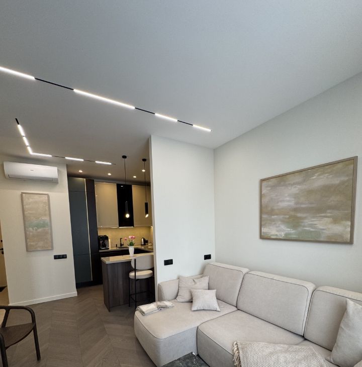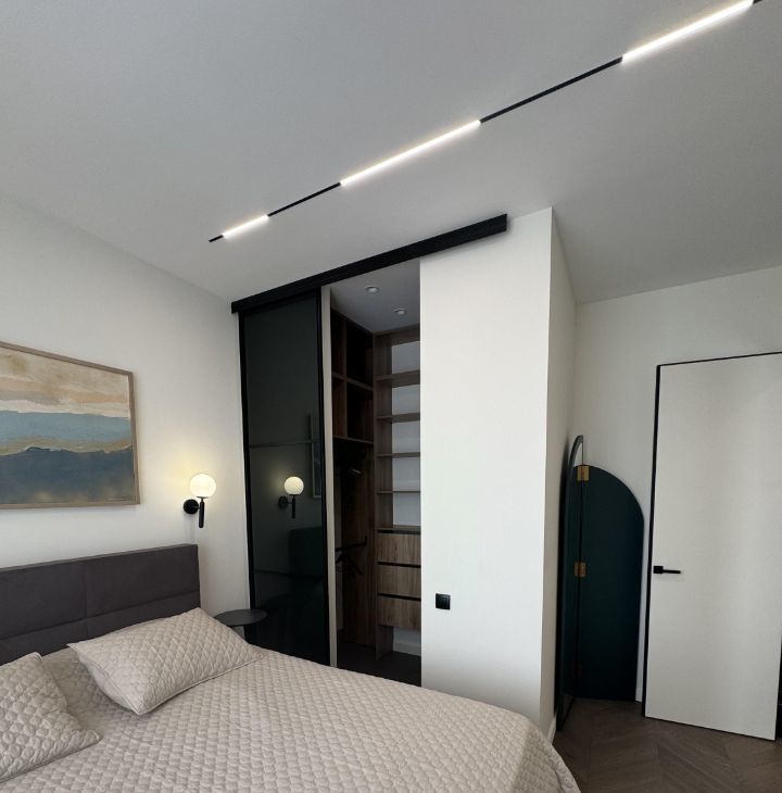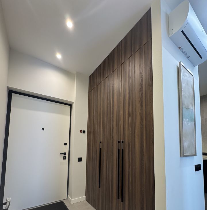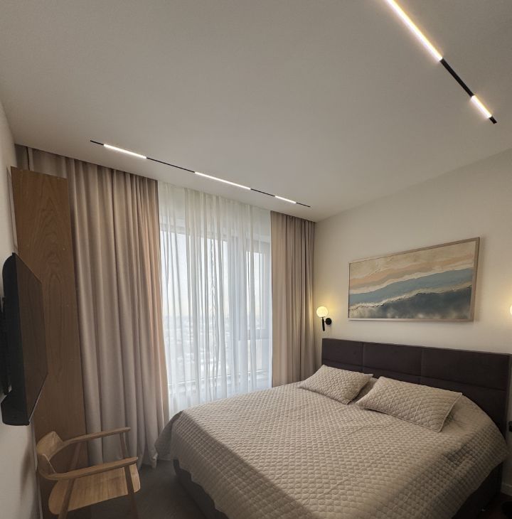 В квартире сделан дизайнерский ремонт, который делали для себя. В комнатах и на кухне есть вся необходимая мебель, пол- паркет. Установлена современная техника: кондиционер, холодильник, посудомоечная машина,телевизор. В ванной комнате — душевая кабина, стиральная и сушильная машины. Вместительная гардеробная.